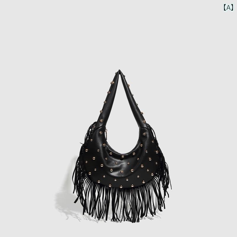 バッグ レディース 欧米風 レトロ 個性的 フリンジ スタッズ ショルダー 斜めがけ PUレザー 柔らかい シンプル 普段使い デイリーユース 三日月型 ファスナー 黒 カジュアル