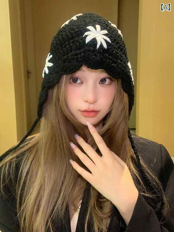 ニット帽 レディース 日韓風 カントリー風 花柄 フラワー アクリル レトロ 秋冬 保温 防寒 防風 耳あて リボン ストラップ ドーム型 かわいい 普段使い カジュアル