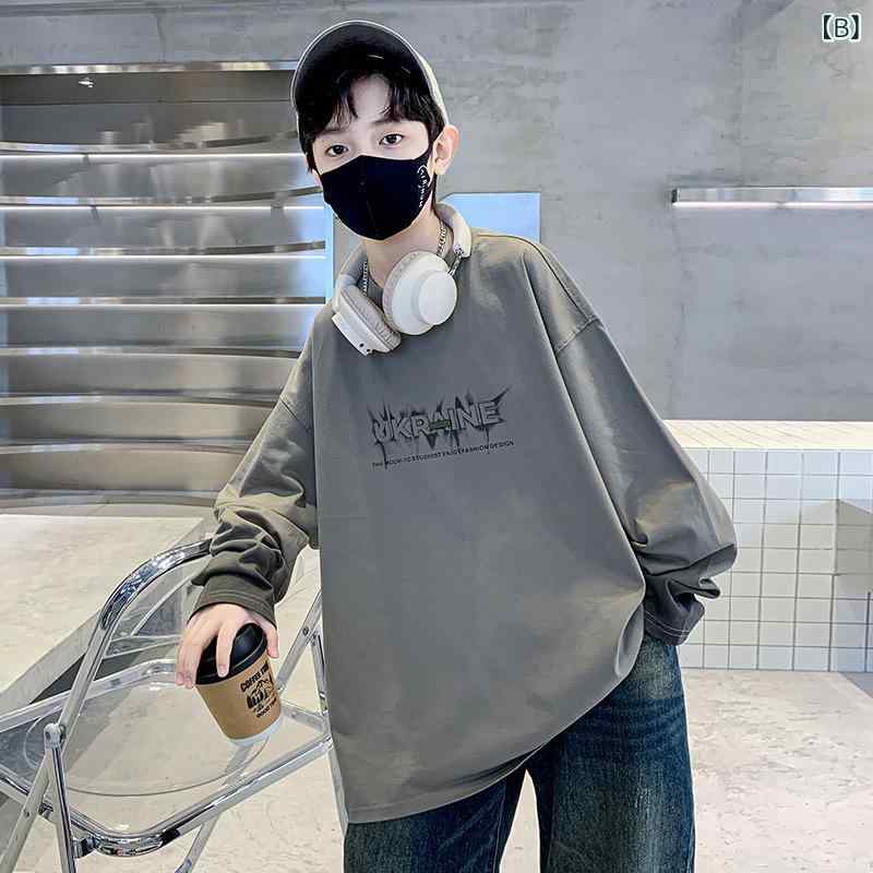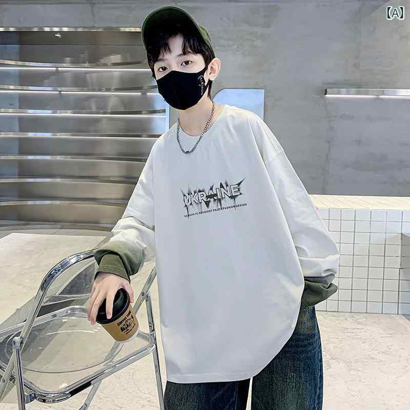 Tシャツ 男の子 長袖 春秋 ゆったり クルーネック ロンT トップス ジュニア ティーン 綿 カジュアル スポーツ 英字プリント 切り替え 普段使い 通学 ホワイト グレー