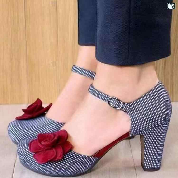 サンダル レディース ラウンドトゥ カットアウト アンクルストラップ 太ヒール ハイヒール チェック柄 超繊維 ブラック ブルー系 春夏 欧米風 エレガント 普段使い オフィス