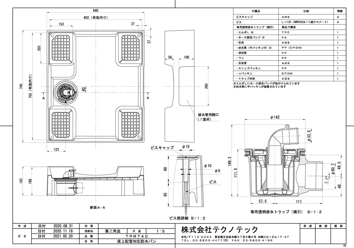 ■商品のご紹介ユニット工法や特殊床構造などで床の穴開けが難しい場合や、既築のアパートやマンションなどで床下に配管を這わすことが出来ない場合に最適な商品です。 防水パンと台座の一体成形型になっていますので現場作り付け架台を手作りする必要がなく施工をが楽になりコスト削減・施工品質の安定へと繋がります。740mmのワイド幅で壁位置に関係なく全ての洗濯機※が収まります。※主要国内メーカーの洗濯乾燥機、全自動洗濯機に対応型番TPR740-W3-FN商品番号049300498本体サイズW740×D640×H193mm有効寸法W702×D602mm材質PP排水穴位置製品図面参照重量約4.6kg耐荷重200kg付属品ビス(5.2×120)×4 ビスキャップ×4 専用排水トラップ 施工仕様書