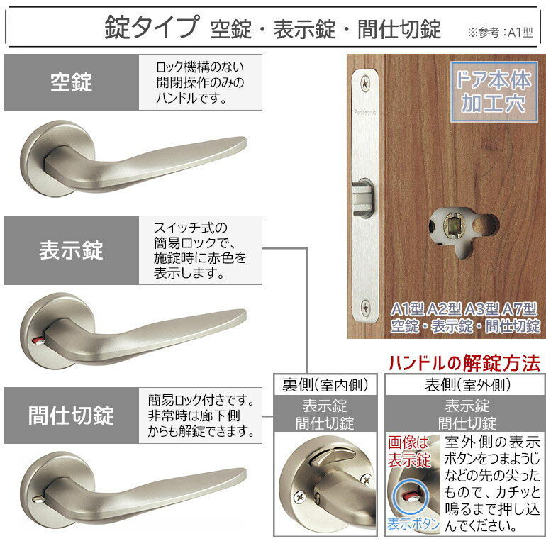>>メーカー希望小売価格はメーカーカタログに基づいて掲載しています ※Panasonic/パナソニック(旧・松下電工)のベリティス 内装ドア 開き戸に使用されている純正品のハンドルです。 LINE UP →●一緒によく購入される商品 A1型ハンドル [→]空錠 サテンシルバー色(塗装) A2型ハンドル [→]空錠 サテンシルバー色(塗装) A3型ハンドル [→]空錠 サテンシルバー色(塗装) ラッチケース [→]ハンドルA1・A2・A3型・A7型・N1・N2型対応。 カバー蝶番 上下セット [→]サテンシルバー色(塗装)またはオフブラック色(塗装)。 カバー蝶番 上下セット [→]サテンシルバー色(メッキ)または真鍮色(塗装)。 ●商品について Panasonic インテリア建材 VERITIS(ベリティス) 内装ドア ハンドルセレクト 開き戸用 取っ手 把手 部材 キー付錠の錠前のみ・裏側(室内側)が丸座 品番:MJE1HA18ST カラー:サテンシルバー色(塗装) 鍵で施解錠ができます。(キー3本付き) 簡易ロック錠ですので防犯性能はありません。 ハンドル(取手/空錠)・ラッチケース・ラッチ受けは付属しておらず、別売り品です。 加工穴が異なるハンドル・錠タイプの交換はできません。 錠の種類は164通りです。 ※複数個ご注文で、キー特注を希望しない場合は鍵(錠)が重複する可能性がございます。 同一キーやキーNo重複無しをご選択の場合、特注品となりメーカー手配日から商品発送までに約2週間かかります。 ※キー特注用の追加料金は錠前の数量分必要となります。予めご了承ください。 ※選択肢以外のキー特注は都度見積もりとなりますのでご注文前にお問い合わせください。 ※ハンドルによってドア本体の加工穴形状・ラッチケースなどが異なります。 ※ハンドルと引手の素材は異なります。 ●配送について Panasonic 引手・ハンドル、錠ケース・ラッチケース、鎌錠受け・ラッチ受け、蝶番であれば同梱が可能ですが、 全ての商品が揃い次第の発送となりますので、各商品の在庫状況によっては当日出荷致しかねる場合がございます。 ※Panasonic製のドア本体・枠セットなど大型商品を同時にご購入の場合、出荷元が異なるため同梱致しかねます。(商品それぞれに送料が発生します) ●送料について ▽1セット〜 →宅配便(追跡番号あり/対面受取/関東・中部・近畿地方800円/東北・中国・四国地方900円/九州地方1000円/北海道・沖縄県1300円) 【 互換性について 】 こちらの商品はPanasonic(パナソニック)の商品です。 メーカーの純正品以外に取り付けると、正常に動作しないなど不具合が生じ、故障の原因になります。※同じメーカー同士でも、シリーズや製造時期によって仕様が異なるため、取り付けができない場合がございます。 ※互換性及び後継品等につきましては ご購入前に 直接メーカーまでご確認をお願いいたします。
