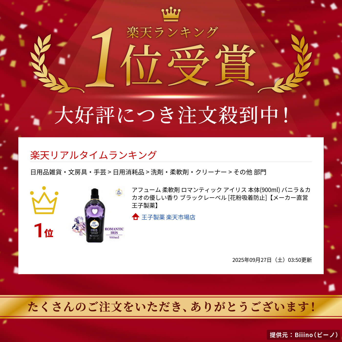 【BF限定★20%OFFクーポン×P10倍チャンス】 アフューム 柔軟剤 ロマンティック アイリス 本体(900ml) バニラ&カカオの優しい香り ブラックレーベル [花粉吸着防止]【メーカー直営 王子製薬】