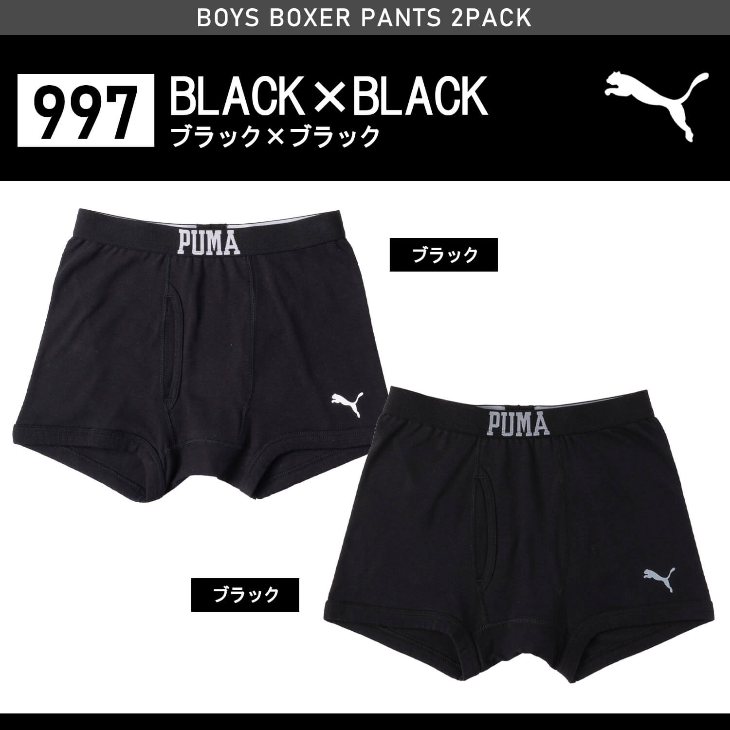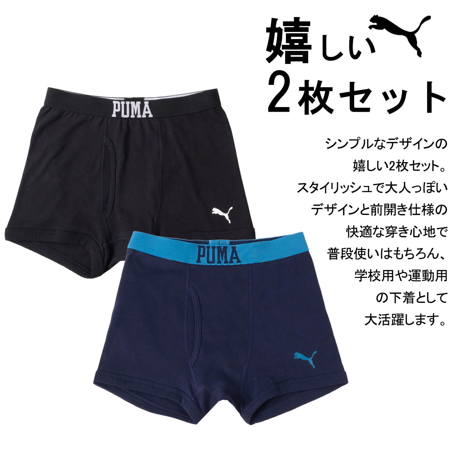 PUMA プーマ パンツ キッズ 下着 ボクサーパンツ 2枚セット ボーイズ 綿100% 前開き 肌着 コットン セットアイテム スポーツ ブランド 無地 ロゴ まとめ買い プレゼント 男の子下着 インナー 黒 紺 2025ss karlas
