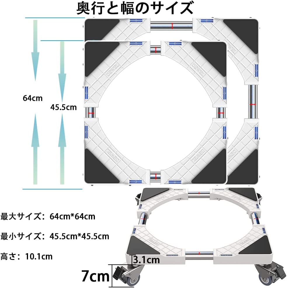 洗濯機 置き台 台 キャスター付き かさ上げ台 置き台 冷蔵庫台 洗濯機パン 360°回転 目盛り付き 耐荷重:300kg 伸縮式 サイズ調整可能 幅/奥行:45.5cm-64cm 減音防振