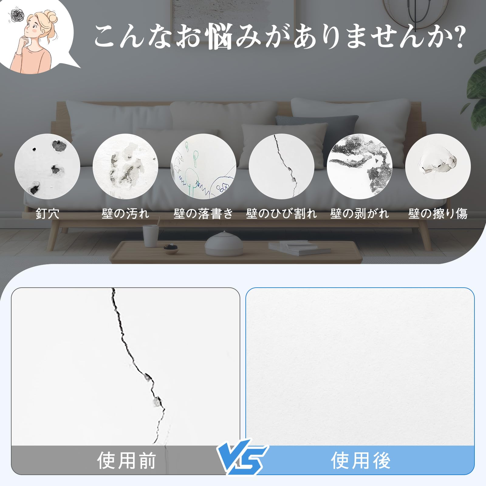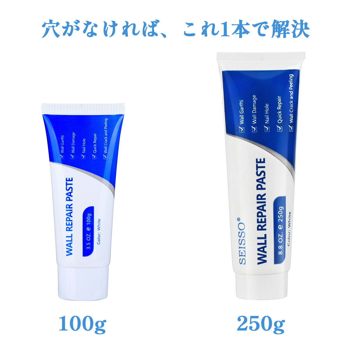 選べる単品販売・全種類ご紹介!壁補修剤 100g 壁補修剤 250g リペアプレート5*5cm リペアプレート10*10cm リペアプレート15*15cm リペアプレート20*20cm ファイバーテープ4.5cm*25m ※壁面の穴が大きいときは壁補修剤とリペアプレートを組み合わせて使うことがおすすめです。 ※リペアプレートのサイズはアルミ板部分のサイズです。ファイバーテープの使用方法穴が小さい場合専用(直径2cm以内): 1.乾いたペーパータオルかタオルで穴の周りを拭きます。 2.穴の大きさを測り、適切なサイズのファイバーテープを切り取ります。 3.裏紙をはがしてファイバーテープを適切な位置に貼ります。穴の周りをしっかり押さえて接着してください。 4.ヘラでパテを繰り返し平らにして、乾燥するのを待ちます(約6時間)。壁に大きな穴があったら、リペアプレート大きな穴、亀裂、釘の穴、はがれた壁を容易に、迅速に補修します。アルミ板が薄くて強度があり、綺麗に仕上がりました。使いやすくうまく穴が隠せました。リペアプレートの使用方法1.乾いたペーパータオルかタオルで穴や割れ目の周りを拭きます。 2.穴の大きさを測り、適切な大きさの壁補修パッチを選びます。 3.裏紙をはがして壁補修パッチを適切な位置に貼ります。アルミニウムの部分は穴の中に覆いて、穴の周りをしっかり押さえて接着してください。 4.ヘラで補修クリームを繰り返し平らにして、乾燥するのを待ちます(約6時間)。かんたんでお金も節約専門業者に頼まず、自分だけでも補修できます。掃除の時も勝手に修正でき、楽でお金も節約でき、時間も節約できます。ご注意※リペアプレートをご注文いただいた場合、サンドペーパー(1-2枚)とヘラ(1本)を同封の上、発送させていただきます。 ※リペアプレートのサイズにより、使い捨て手袋が付属しない場合がございます。あらかじめご了承ください。