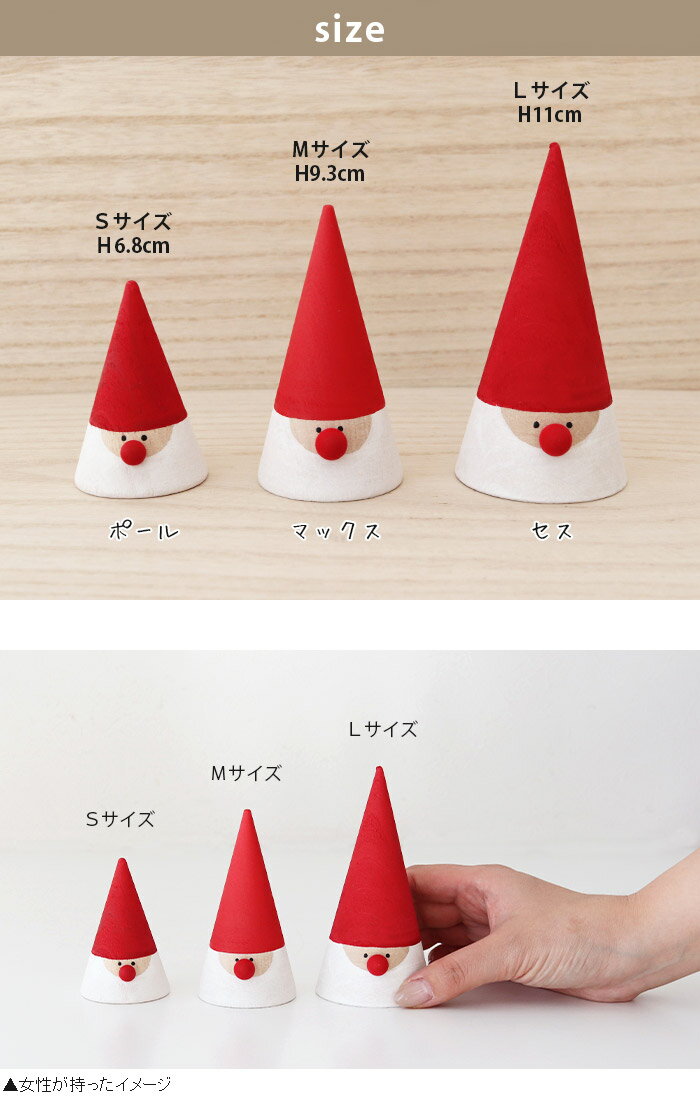 【製品仕様】 ■サイズ: Sサイズ / 約W4×D4.7×H6.8(cm) Mサイズ / 約W4.9×D5.3×H9.3(cm) Lサイズ / 約W5.3×D6.2×H11(cm) ■素材: 木製 ■ブランド:Larssons Tra(ラッセントレー)/スウェーデン ■生産国:スウェーデン ▲ラッセントレーを全て見る ■コメント: 北欧スウェーデンのラッセントレー社の木製トムテ。トムテとは北欧に古くから伝わる妖精のこと。サンタクロースのお手伝いをする小人として、また家庭に幸福をもたらす存在として愛されています。 こちらは、円すい型の木製オブジェ。Sサイズ、Mサイズ、Lサイズの3種類があり、それぞれ「ポール」「マックス」「セス」という名前もあります。シンプルなデザインですが、真っ赤なおはなをチャームポイントにかわいらしさが目を引きます。また、コンパクトサイズなので、玄関や窓辺など小さなスペースにも飾りやすいです。 ラッセントレー社のオブジェは天然木を使ったハンドメイドアイテムなので、ひとつひとつ表情が違ったり木材の持つ素朴さや温もりが感じられ、クリスマスシーズンをほっこり彩ります。 ■関連オススメ商品: ▲プルートデザインのアイテムをすべて見る ▲ぽれぽれクリスマスコレクションを全て見る! ▲concombreのクリスマスを全て見る! ▲アーリッカを全て見る ▲クリスマスアイテムを全て見る北欧スウェーデンのラッセントレー社の木製トムテ。トムテとは北欧に古くから伝わる妖精のこと。サンタクロースのお手伝いをする小人として、また家庭に幸福をもたらす存在として愛されています。 こちらは、円すい型の木製オブジェ。Sサイズ、Mサイズ、Lサイズの3種類があり、それぞれ「ポール」「マックス」「セス」という名前もあります。シンプルなデザインですが、真っ赤なおはなをチャームポイントにかわいらしさが目を引きます。また、コンパクトサイズなので、玄関や窓辺など小さなスペースにも飾りやすいです。 ラッセントレー社のオブジェは天然木を使ったハンドメイドアイテムなので、ひとつひとつ表情が違ったり木材の持つ素朴さや温もりが感じられ、クリスマスシーズンをほっこり彩ります。 ▲アーリッカやぽれぽれと並べると更にかわいい ▲真っ赤なまん丸おはながチャームポイント ▲他のアイテムと組み合わせて素敵なクリスマスの演出に ▲ラッセントレーの木製オブジェを全て見る ▲ぽれぽれクリスマスコレクションを全て見る! ▲concombreのクリスマスを全て見る! ▲クリスマスアイテムを全て見る ▲ミッドセンチュリーの巨匠 スティグ・リンドベリ ▲みんな大好き!「マリメッコ」はこちら! ▲プルートデザインのアイテムをすべて見る