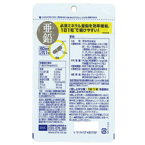 ●必須ミネラルとは生命活動に欠かせない栄養素のこと。亜鉛はその一つで、たんぱく質の合成や新しい細胞を生み出すのに欠かせない成分です。味覚や皮膚・粘膜の健康維持をサポートします。男性能力にも不可欠なため、アメリカでは「セックスミネラル」と呼ばれることも。DHCの「亜鉛」は、規格基準を満たす栄養機能食品。さらに、健康値対策に役立つクロムと若々しさをサポートするセレンも配合しました。食事が偏りがちな方や男性パワーにお悩みの方におすすめです。●内容量/60粒(約60日分)●1日の摂取量目安/1粒●形状/ハードカプセル※賞味期限について:商品の発送時点で、賞味期限まで残り180日以上の商品をお届けします。●メーカー/DHC●型番/270939●JANコード/4511413403730<パッケージ裏面>※メーカー都合によりパッケージ・仕様等が予告なく変更される場合がございます。ご了承ください。本商品は自社サイトでも販売しているため、ご注文のタイミングにより、発送までにお時間をいただいたり、やむをえずキャンセルさせていただく場合がございます。※沖縄へのお届けは別途1650円(税込)の送料がかかります。