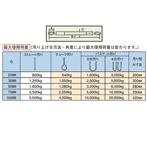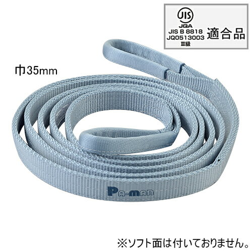 【Pa-manオリジナル】 この商品は安全・安心をテーマに、ご利用者目線で開発したパーマンオリジナル商品です。 高コスパでかつ修理、メンテナンス体制も完備しておりご購入後も安心! JIS JQA JIS B 8818 JQ0513003 III級 産業標準化法に基づくJISマーク表示制度において 一般財団法人日本品質保証機構が規格適合したことを認証した商品 ●長さ:2.5m ●巾:35mm ●材質:ポリエステル ●ポリベルト・スリング ※ご注文前に必ずご確認ください。 ●最大使用荷重:ストレート吊り/1,250kg チョーク吊り/1,000kg バスケット吊り(2点吊り)/2,500kg バスケット吊り(4点吊り)/5,000kg ●吊り部A寸法:200mm ●自重:0.68kg ●ポリベルト・スリング点検基準 ・磨耗:縫目がわからない程に毛羽立ちしていてタテ糸が 損傷しているものは廃棄。 ・損傷:厚さ方向に対して1/5以上、巾方向に対して1/10以上の 傷の有るものは廃棄。 ・縫製部:縦糸が著しく切断したものは廃棄。特に縫製部の糸切れ、 ベルトの剥離には注意。 ・その他:熱・薬品による著しい損傷のあるものは廃棄。 極端な硬化、軟化のあるものは廃棄。荷重をかけない状態で 新品時に比べて著しく伸びたものは廃棄。 ※水・油などが付着すると滑りやすくなるので注意してください。 ※最大使用荷重は吊り上げる方法・角度により変わります。