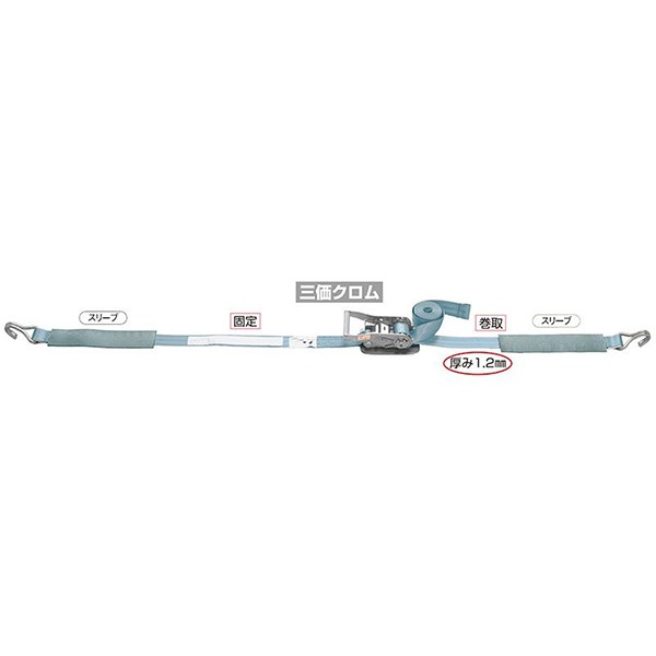 【Pa-manオリジナル】 この商品は安全・安心をテーマに、ご利用者目線で開発したパーマンオリジナル商品です。 高コスパでかつ修理、メンテナンス体制も完備しておりご購入後も安心! ●Jフック ●ベルトサイズ:巾50×1.2mm ●固定:1m ●巻取:5m ●最大使用力:550kg ●破断荷重:2,200kg ●材質:ポリエステル ●付属品:ラチェットプロテクター、スリーブ2ヶ ●自重:2.5kg ※本品は180度以下でご使用ください。 ●幅50mm Jフック 商品一覧 品番固定巻取フック形状JIS規格その他特徴 6473015000 0.5m 5m Jフック - - 6473215000 7m 厚み2mm 6472623000 厚み1.2mm 6475600000 0.6-2m 5m - 6479367000 1m ○ 厚み2mm、クロムメッキハンドル 6479565000 厚み2.8mm、クロムメッキハンドル 6479807000 厚み3.5mm 6472621000 - 厚み1.2mm 6472815000 厚み2mm、クロムメッキハンドル 6473115000 厚み2mm 6479802000 ○ ステンレスハンドル 6479569000 7m - 6473315000 1.3m - 6479592000 2m ○ クロムメッキハンドル 6479570000 - 8m Jフック(スイベル) - 6479371000 12.2m Jフック(スイベル/外れ止め) トレーラー荷台サイド張用 6479372000 14m 6472624000 0.5m 7m Jフック(マグネット付) - - 6479368000 1m 5m ○ 6479587000 7m 6479586000 Jフック(外れ止め付) 6479369000 1.3m 6479370000 3m 5m