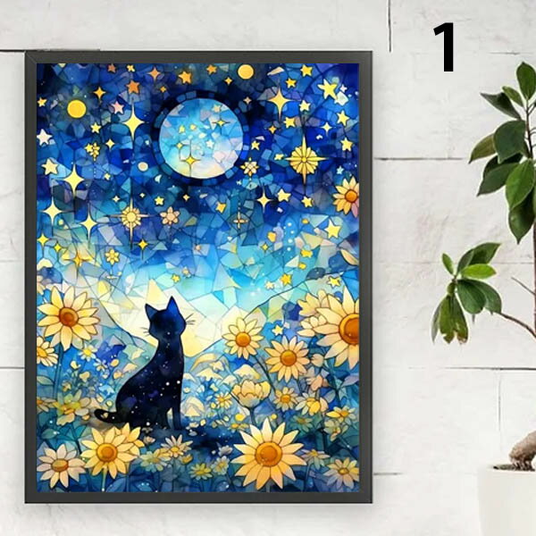 中級 フル ダイヤモンドアート キット ビーズ刺繍 ステンドグラス風 黒猫 ひまわり モザイクアート リハビリ 趣味 絵画 カラービーズ