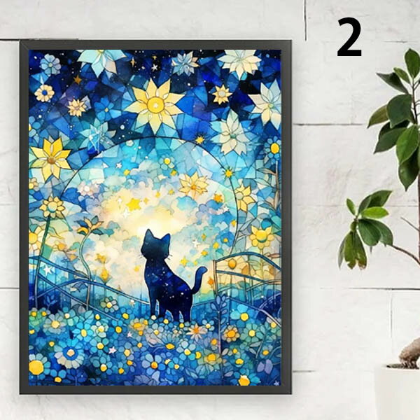 大人も子供も楽しめるダイヤモンド・カラービーズ刺繍です! 番号と該当のビーズを貼っていくと、カラフルなモザイクアートが仕上がります。 集中力を高めたい方や新しい趣味の発見、リハビリに、ゆったりした一人の時間を楽しむのも◎お友達とみんなで楽しむのも◎ 仕上がった作品は額に入れて飾ったり、そのまま壁に掛けてると、立派なインテリア絵画になります! ※掲載写真と多少色の出・発色が異なる場合がございますのでご了承下さい。 【デザイン】 ひまわり畑で空を見上げる黒猫のステンドグラス風デザインです。 仕上がった作品は、リビングや寝室、玄関や廊下に展示してください。 ◆こちらは全面貼り・フルドリルタイプになります。 ◆サイズ:約30×40cm(キャンバスの余白含む) ◆セット:ノリ付きキャンバス、樹脂ビーズストーン、トレー、接着ペン、接着ノリ (セットにフレームは含まれません。)