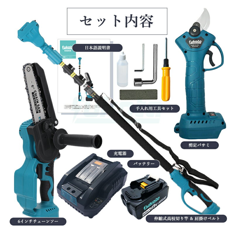 ■商品情報■ 商品名 高枝切り竿・チェーンソー・剪定バサミ・充電器・バッテリー5点セット セット内容 Polepruner 高枝切り竿(肩掛けベルト付き) BLX16153P 6インチハンディーチェーンソー RDJ500 剪定バサミ DC18RCmini 充電器 BL1860B バッテリー 手入れ用工具セット5点セット 日本語取扱説明書 【充電器】 出力電圧 直流 14.4V〜18V 出力電流 直流 3A 定格電圧 100〜240V 【バッテリー】 電圧 18V 容量 6000mAh (6.0Ah) 商品情報 電池種類 : リチウムイオンバッテリー(Li-ion) 着脱方式 : スライド式 認証 : PSE・CEマーク取得済 保護回路 : 低電圧保護 / 加熱保護 / 過放電保護 / 短絡保護 / 低温保護 / 過電流保護/ バッテリー保護 LEDランプ : 一目でわかるLEDランプ付き メロディ機能付き : 充電完了をメロディでお知らせ 【剪定バサミ】 定格電圧 18V/21V 最大パワー 500W 最大剪定幅 25mm ハイパワーで簡単に切断可能な充電式剪定ばさみ ブラシレスモーターを採用で強力なパワーを備えており、30mm以内の木を簡単に切断できます。 またポータブルと滑り止めのハンドヘルドで、より長く作業しやすくなりました。 ナイフサイズは10mm、15mm、20mm、30mmという四つモード。 電源ボタンを押して、モードを切替可能です。 (注:引き金と電源ボタンを同時に使わないでください。モードを切り替える際には引き金を引かないで、電源ボタンしかを押しないでください。) 【ハンディーチェーンソー】 定格電圧 18V/21V 最大パワー 550W 回転速度 2703(R/MIN) チェーンソーに求めるのは切断力と疲れにくさ 最大切断幅150mm。 550Wの高出力純銅モーターを搭載。 強力で耐久性に優れ、素早くモーターを冷却することでより高い効率で木材を切断いただけます。 直径15センチの木材を15秒でカットできます。 鋭いのこぎりの刃は焼入れの加工施された素材を採用しており、高硬度で耐磨耗性にも優れています。 チェンソーの重さはわずか1.4kg。 コンパクトなサイズで、持ちやすく、女性でも片手で使用できます。 長時間使用しても、疲れにくいです。 【取り外し型高枝切り竿】 定格電圧 18V/21V 伸縮幅 125cm〜250cm 1台四役高枝切り竿 セットのチェーンソー(または電動ハサミ)と高枝切り電動チェーンソー(高枝切りの電動ハサミ)を自由に切り替え、ポールを外して手持ちのチェーンソー(または電動ハサミ)としての使用が可能です。 伸縮ポールは無段階で125cm〜250cmまで伸ばすことができ、 最大250cm長さのポールで、 作業をより安全かつ効率的に行うことができます。 ヘッド部分も角度調整ができるので、枝切りを楽に。 作業環境とニーズに合わせて使用できます。 用途について 公園、果樹園、庭園、牧草地、観葉植物、農場などで果樹や花、つるのある植物の剪定を簡単に行うことができます。 緑化修理、枝竹切断、DIY木製品、家庭用など幅広い用途に使用することができます。 品質向上の取り組み 品質管理が徹底された専門工場で製造しております。 保証について ・ご購入日から1年の間(条件により1年半)、製品に不具合が生じた場合は交換対応いたします。 ・在庫状況により交換品がないなどの場合は返金対応させていただきます。 ・水没・破損・加工・分解の形跡・外観に大きな損傷・過酷な使用状態と思われるものは、保証対象外となります。 ・外観で判断が出来ない状況の場合、メーカーの内部調査を行わせていただく場合がございます。 領収書について 楽天TOPから「購入履歴一覧」-「注文詳細を表示」-「領収書を発行する」 電子領収書としてPDF形式で発行することができます。 宛名のみ空欄で出力されますので、印刷後にご記入ください。 配送について 【配達不可による返送品について】 [長期不在]・[受取拒否]・[配送先住所登録不備]などにより、商品が『配達不可による返送』がございました場合、配送会社指定の往復運賃を追加させていただく場合がございます。 商品発送後のキャンセルの場合は、ご請求金額から往復運賃を差し引いた金額を払い戻しさせていただきます。 (キャンセルの場合は、キャンセル処理とならず、ご請求金額の訂正処理となりますのでご了承ください。) 注意事項 ・本製品を使用した際に発生したトラブル、破損、事故等による弁済、保証等につきましては、商品代金以外一切の責任を負いかねますので、あらかじめご了承ください。 ・輸入品の為、輸送の際に生じるキズ・汚れ・箱潰れがある場合がございます。 ・サイズ・重量は、多少の誤差が生じる場合がございます。 ・画像はイメージですので、商品改良の為パッケージや一部仕様が変更になる場合もございます。 ・お使いのブラウザや設定により、画像と実際の商品との若干の色の違いが生じる場合がございます。 ・会社概要・お買い物ガイドに他にも詳しく記載しておりますので事前に確認していただくことをお勧めいたします。 ※ご購入の前にご希望商品の対応形名一覧より、適合商品である事をご確認願います。 ※購入検討商品に関してご不明な点やご不安をお持ちの