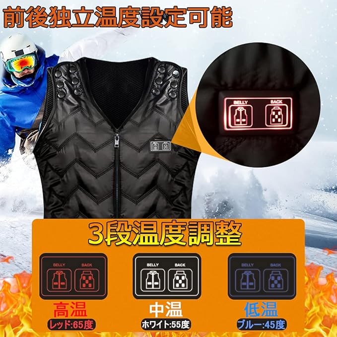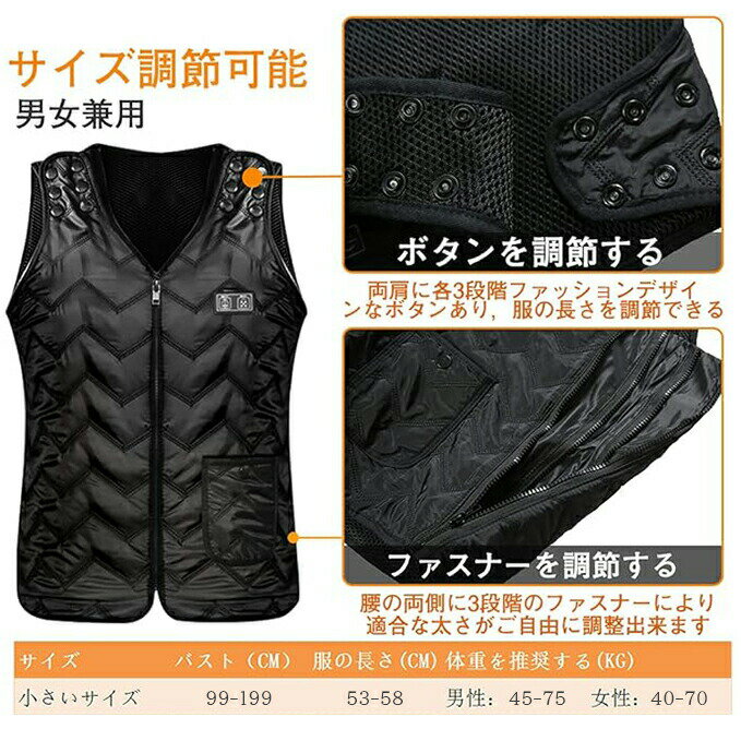 この商品について ●メイン素材: 100% ポリエステル ●【サイズ調節可能の電熱ベスト】電熱ベストがサイズを調整することができます。電熱ベストの両肩に各3段階ファッションデザインなボタンあり、腰の両側に3段階のファスナーにより適合な太さがご自由に調整出来ます。幅広い体型の方に対応可能です ●ヒーターベスト は最新なグラフェン繊維材質加熱シートを採用しております。電源を入れた後、スイッチを入れてから約60秒で感熱する抜群の即暖機能を持たせました。 ●体が有効に温める為、腹、肩、背中、腰の7箇所にヒーターを内蔵されます 二つスイッチが前、後加熱区を分別してコントロール、3段の温度{高(レッド:65度)、中(ホワイト:55度)、低(ブルー:45度)}を自由変換でき。長く押し3-5秒加熱開始、クリックモードチェンジ、 外部環境と電熱ウェア の状態によって自由調整、いつでも欲しい温度に変換できる、加熱部分思うままにする,保温に要求をもっと足する ●自宅、オフィス、車内、バイク、スポーツ観戦などの防寒対策にビッタリですヒートジャケット 3段調温 二つスイッチが前、後加熱区を分別してコントロール、3段の温度{高(レッド:65度)、中(ホワイト:55度)、低(ブルー:45度)}を自由変換でき。長く押し3-5秒加熱開始、クリックモードチェンジ、 外部環境と電熱ウェア の状態によって自由調整、いつでも欲しい温度に変換できる、加熱部分思うままにする,保温に要求をもっと足する 7つのヒーター ヒーターベスト は新なグラフェン繊維材質加熱シートを採用しております。電源を入れた後、スイッチを入れてから約60秒で感熱する抜群の即暖機能を持たせました。体が有効に温める為、腹、肩、背中、腰の7箇所にヒーターを内蔵されます。7箇所で同時に温めて、真冬でも体を暖かくして、寒さを恐れず、冬を楽しむことができます 電熱ベストはUSBケーブルが付いて、,改良した厚いゲージUSBケーブル、耐久性よい、使用寿命長くなる 様々な適用範囲 自宅、オフィス、車内、バイク、スポーツ観戦などの防寒対策にビッタリです。釣り、バイク、ゴルフ、スキー、登山、屋外作業、夜勤、小外出、家の中、通勤などの寒い日に 複数の効果&血液循環効果 加熱ベストは寒さや暖かさから保護するだけでなく、さらに重要なこととして複数の機能を備えています。腰の疲労と痛み、胃のむかつきの症状を和らげます。血液循環を効果的に促進する、筋肉のこりを緩和、新陳代謝を上げ、体の機能を正常に保ちます 優質な生地&水洗い可能 軽薄で、手触りが細かくて、柔らかくて、保温が良くて、変形しにくくて、シルクを通すことができないなどの優良な性質を持っています。水と風を防ぎ、手で水洗えるだけでなく、洗濯機でも洗えます (注意:洗濯機で洗う場合は、ベストの損傷を防ぐ為に洗濯ネットに入れてお洗いください。洗濯の前にモバイルバッテリーを取り外してください)