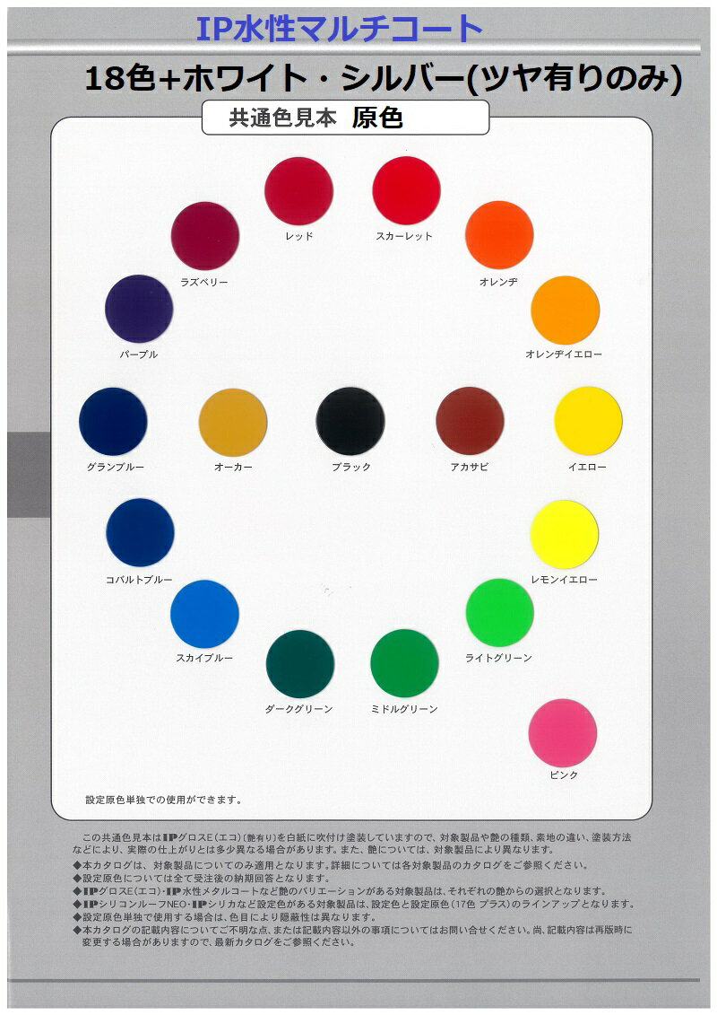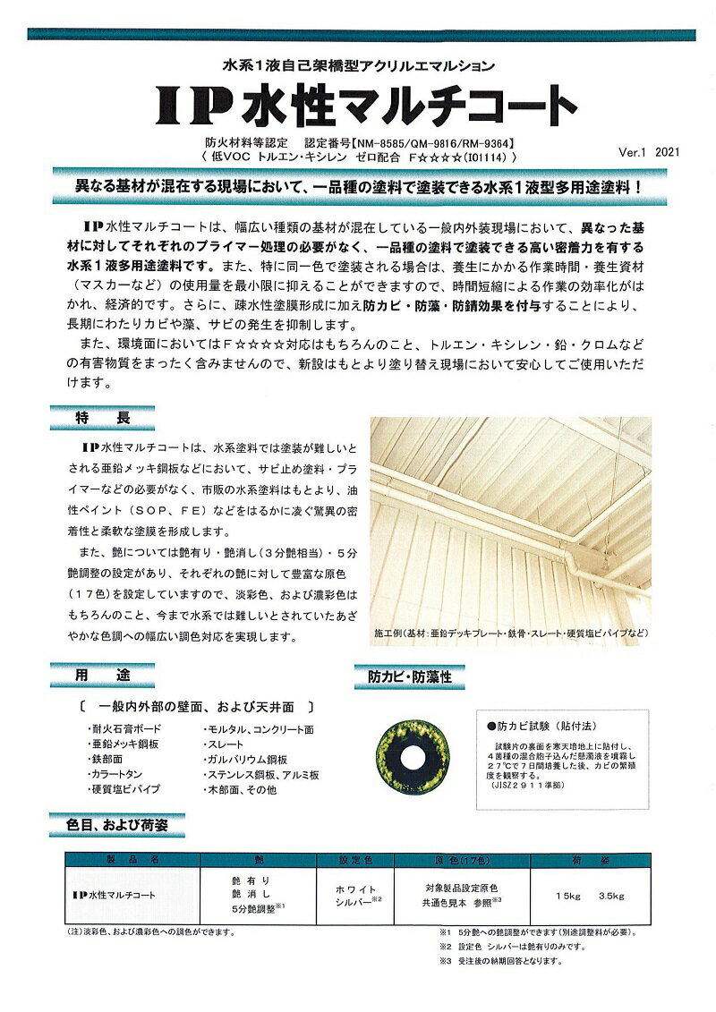 商品情報 色 原色(全20色)容量 15kgインターナショナルペイント IP水性マルチコート 原色 15kg 全20色 外壁 建築 鉄部 木部 亜鉛メッキ ガルバリウム 異なる基材が混在する現場でこの塗料一つで様々塗れる! IP水性マルチコート 15kg 原色(全20色) 異なる基材が混在する現場において、一品種の塗料で塗装できる水系1液型多用途塗料!■特長・様々な素材に塗ることができ、特に同一色で塗装される場合は塗料の種類を増やすことなく経済的です。・疎水性塗膜形成に加え、防カビ・防藻・防錆効果を付与することにより、長期にわたりカビや藻、サビの発生を抑制します。・トルエン・キシレン・鉛・クロムなどの有害物質を全く含みませんので、新設はもとより塗り替え現場において安心してご使用いただけます。・3種類のツヤ調整に対応し、それぞれのツヤに対して豊富な原色を設定していますので、今まで水系では難しいとされてきた鮮やかな色調での調色が可能となります。■用途 一般内外部の壁面、天井コンクリート、モルタル、サイディングボード、鉄部、亜鉛メッキ鋼板、ガルバリウム鋼板、ステンレス、アルミ、木部、硬質塩ビなど(※アクリル板、軟質塩ビには塗装できません。)(※金属面に塗装する場合には、下塗りに適性のあるサビ止メが必要。)■希釈率・水3〜5%■塗布面積・15kgで約60〜65m2塗れます(2回塗り) 1