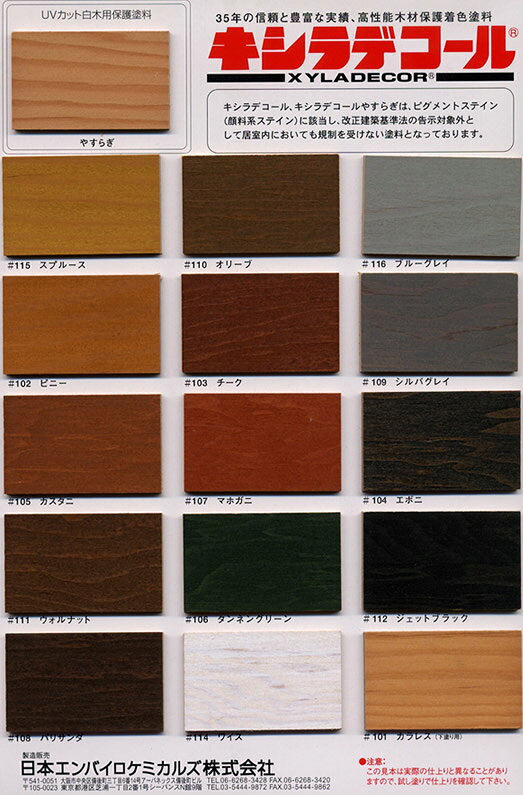 製品仕様 商品名 キシラデコール#112ジェットブラック4L 注ぎ口(ベロ付き)【大阪ガスケミカル株式会社】油性 木部 保護塗料 ウッドデッキ 木 屋外 防腐 防虫 塗料 内容量1缶 /4L 成分油性木材保護塗料 色#112ジェットブラック ご注意事項モニターの発色の具合によって実際のものと色が異なる場合がございます。ご了承ください。 その他商品説明特徴・木材に浸透し、内部から腐れやカビ、ムシによる被害を防ぎます。・木材の持つ色調のばらつきやムラなどを整え、木肌の美しさを引き出します。・色もちのよさを誇る耐候性日光や風雨に強い耐候性顔料が使われていますので、鮮明な色が長持ちし、長期にわたって木材を保護します。用途・塗膜を作らないので、塗り替えの際もゴミやほこりを落とすだけで上塗りすることができるなど、メンテナンス性にも優れています。 備考沖縄・離島・一部地域は別途送料かかります。 当店では2014年3月31日23時59分までは、販売価格を旧税率で表示しています。 出荷や発送が4月1日以降になる場合は別途増税分をご請求させていただく場合がございます。 関連商品商品詳細