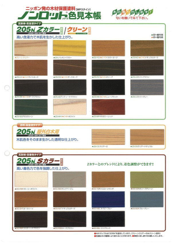 製品仕様 商品名 ノンロット205N Zカラーシリーズ 14L 各色 注ぎ口(ベロ付き)【三井化学産資】 内容量1缶 /14L 色14色 種類木が香る木材保護含浸塗料 ご注意事項モニターの発色の具合によって実際のものと色が異なる場合がございます。ご了承ください。 その他商品説明特徴・耐UV:特殊顔料が木材に深くしみ込み、紫外線を効果的に反射、吸収して木を守ります。・撥水性:雨水をはじき、水滴状態で木の内部に染み込むのを長期にわたり防ぎます。・防腐・防カビ・防虫:3種類の薬剤が木の内部にしっかり含浸してその効果を発揮。消防法による危険物第4類第2石油類です。取扱いは火気厳禁用途・ログハウス、木造一般住宅、学校、スポーツ施設、神社仏閣、遊園地の木造遊戯施設、杭 当店では2014年3月31日23時59分までは、販売価格を旧税率で表示しています。 出荷や発送が4月1日以降になる場合は別途増税分をご請求させていただく場合がございます。 関連商品 ノンロット塗装キット油性用 【三井化学産資株式会社】 刷毛 トレイ 内容器 缶オープナー500円商品詳細