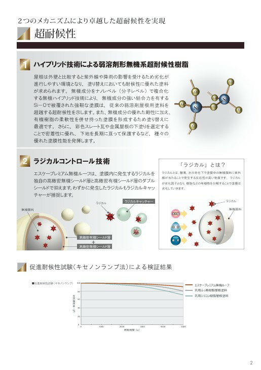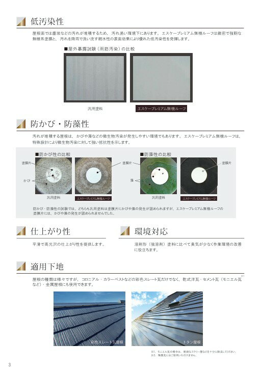製品仕様 商品名 エスケープレミアム無機ルーフ ※RC-115サックスブルー 艶有 15kgセット【エスケー化研】 *代引決済不可、キャンセル不可 内容量1セット /15Kg 特長・超耐候性ハイブリッド技術による弱溶剤形無機系超耐候性樹脂やラジカルコントロール技術により、超耐候性を示します。・低汚染性屋根面では塵埃などの汚れが堆積するため、 汚れ易い環境下にあります。 エスケープレミアム無機ルーフは緻密で強靭な無機系塗膜と、汚れを降雨で洗い流す親水性の表面効果により優れた低汚染性を発揮します。・防かび・防藻性汚れが堆積する屋根は、かびや藻などの微生物汚染が発生しやすい環境でもあります。エスケープレミアム無機ルーフは、特殊設計により微生物汚染に対して強い抵抗性を示します。・仕上がり性平滑で高光沢の仕上がり性を提供します。・環境対応溶剤形(強溶剤)塗料に比べて臭気が少なく作業環境の改善に役立ちます。・幅広い下地適用性屋根の種類は様々ですが、コロニアル・カラーベストなどの彩色スレート瓦だけでなく、乾式洋瓦・セメント瓦(モニエル瓦など)・金属屋根にも使用できます。 一般名称二液弱溶剤形屋根用無機塗料 用途戸建て住宅・アパート・工場などの建築物の勾配屋根(彩色スレート瓦・金属屋根・トタン屋根)など※薄型塗装瓦・スレート屋根の場合、基材自体の強度低下が著しく、塗装できない場合もありますのでご注意ください。 荷姿15kgセット(主剤:12.5kg石油缶、硬化剤:2.26kg角缶) 標準塗坪15kgセット (コロニアル)50~57m2/セット、(トタン)53~68m23/セット 艶艶有り 希釈塗料用シンナーA 塗装方法吹付、ローラー、刷毛 注意事項・標準塗坪は、一般的なものであり、下地の状態や環境などによる所要量の増減に応じて変わることがあります。・施工に際しては施工仕様書および製品容器に記載の注意事項を必ずご覧ください。また、製品の取り扱いは、それぞれの安全データーシート(SDS)に従ってください。・下地の種類に応じ、適切な下塗材を選定してください。 当店では2014年3月31日23時59分までは、販売価格を旧税率で表示しています。 出荷や発送が4月1日以降になる場合は別途増税分をご請求させていただく場合がございます。 関連商品