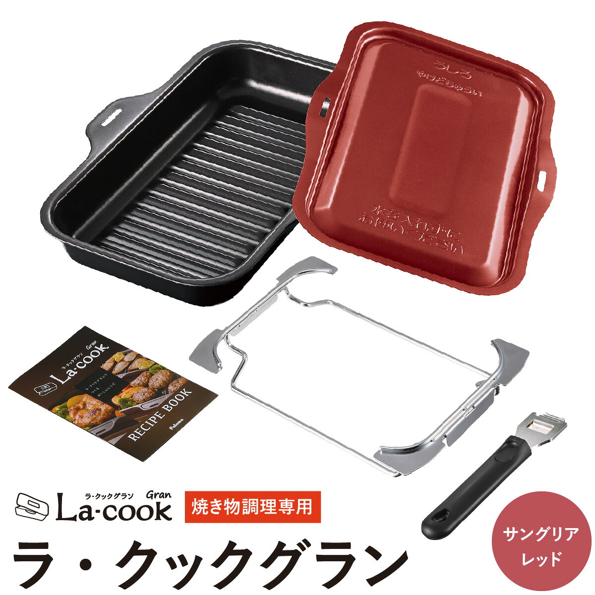 さんまも丸ごと1匹焼ける大型「ラ・クックグラン」登場! 大好評グリル調理容器ラ・クックシリーズに新たに広くて大きい「ラ・クックグラン」登場。おもてなしなど、たくさん作りたい時にも安心です。 ラ・クックグランセットPGDL-50R ■カラー:サングリアレッド ■セット内容:本体、ふた、ハンドル、専用受け台、専用レシピ ■製品サイズ:(約)/長さ303×幅232×高さ51mm(つまみ含む65mm) ■質量:1090g(ふた含む) ○塗料の性質上、高温になると色が変色しますが、常温になると元の色に戻ります。 ○ラ・クックグランは焼き調理専用です。汁物調理や水を入れて使用しないでください。燃焼不良の原因になります。 ※ラ・クックグランを加熱した際はふたのつまみが大変熱くなりますので、ハンドルを使用していただくかミトンなどを使用してください。 油汚れ99.9%カットを実現 油の飛び跳ねを大幅低減! 焼き網で調理したものは、一回焼いただけで油でベトベトですが、ラ・クックでの調理は10回焼いてもグリル庫内はピカピカです。 遠赤外線効果でふっくらジューシー&焼き目キレイ ラ・クックはセラミック塗装が施されていることもあって遠赤外線効果があるのが特徴です。 だからふた付きでもきれいな焼き目がつくうえに、食材のおいしさをぐっと引き出して、炭火焼きのようにジューシーに仕上げられます。 丈夫で長持ちする「Wセラミックコート」を採用 耐久性に優れ、汚れにも強い「Wセミラックコート」をふた・本体に採用しています。油をはじくため、お手入れもラクになります。 さらにこびりつきも防止してくれる造りとなっています。 ラ・クックグランならもっと便利に ふだんの家族の食事やお弁当のおかずはラ・クック、おもてなしなど、たくさんつくりたい時は、大きめサイズのラ・クックグランで手早くおいしく、2つを揃えておけば使い分けが出来たり、連続で調理もできてさらに便利です。 一度にたくさんつくれる、丸ごと調理も得意 広くて大きいラ・クックグランなら、鶏の胸肉やもも肉も丸ごと野菜と一緒に調理でき、大きなサーモンの切り身もキレイに並べて焼けます。 朝食のスコーンも家族みんなのぶんが一度に焼けるから、忙しい朝にもピッタリです。 おもてなしも安心! 広くて大きいラ・クックグランなら、鶏の胸肉やもも肉も丸ごと野菜と一緒に調理でき、大きなサーモンの切り身もキレイに並べて焼けます。 朝食のスコーンも家族みんなのぶんが一度に焼けるから、忙しい朝にもピッタリです。ラ・クック カラーバリエーション   ブラック   ≫ サングリアレッド ≫ トリュフブラウン ≫ その他のオプション