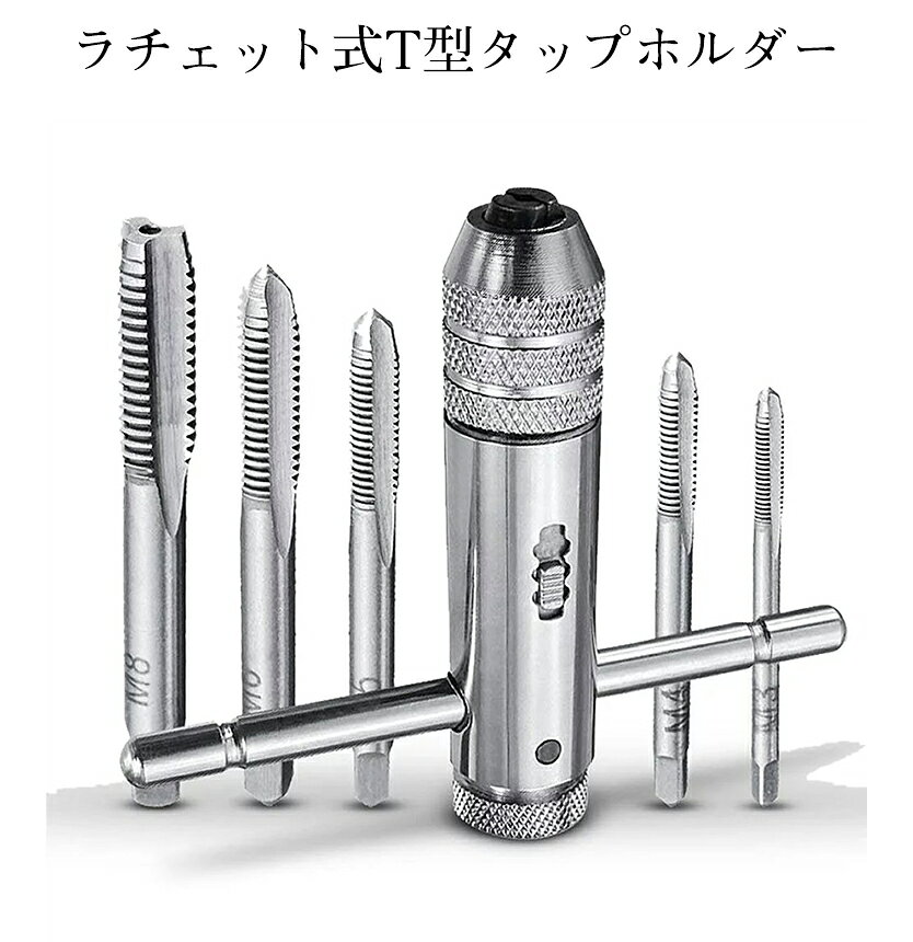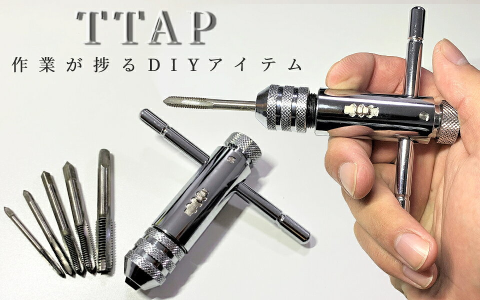 【楽天週間ランキング1位獲得】 ※2022年11月9日(水)更新 (集計日:10月31日?11月6日) ================= 【TTAP -T型ドリルネジキリ- 】 簡単にネジ穴が作れるアイテムです。 ラチェット機構を搭載したT型タップホルダー回転方向の切替が可能です。 上部ハンドルは、スライドさせて使用可能です。 T型デザインは迅速かつ効率的なラチェットアクション用のM3-M8付きで 簡単にねじ立てが可能です。 狭いところでも片手でラクに作業ができます。 金属加工や家具DIYにも使いやすいアイテムです。 ================= 【商品仕様】 M3[46mm]・M4[50mm]・M5[57mm]・M6[60mm]・M8[63mm]各1本付 ※メートル制 材質:工具鋼 重さ(約):220g 着脱式スライドハンドル,適用タップ寸法:M3-M8。 ================= ※日本語操作説明書は付属いたしておりませんので、操作方法は商品画像説明をご覧ください。 ※詳細は画像をご覧ください。 お得なセット商品はこちらをクリック【NEW】穴開け作業がすいすいドリルは↓コチラ↓ 【大人気】なめたネジを救出する当店自慢の6本セットは↓コチラ↓ DIYの質が上がります。 [ドリル切れ味回復研磨機] は↓コチラ↓ ワイドなワイルド工具。アイデア商品のモンキーレンチは↓コチラ↓ 磁力が無いドライバーに付けるだけ [六角軸磁石化ツール] は↓コチラ↓
