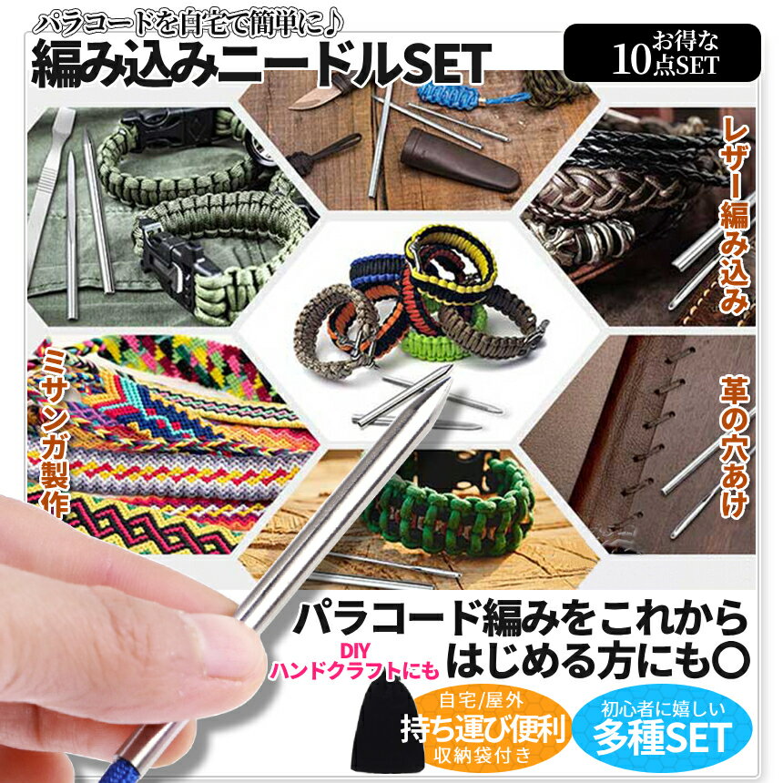 【商品説明】 \パラコード編み込みを始める方必見お得セット♪/ 「扱いやすい」多種セットのパラコード用ニードルです。 使用頻度の高い直線ニードルの他、曲線、屑糸鋏も入った 編み込みスターターセット♪ パラコード編み込みの他にも ミサンガ製作やレザークラフトにも活用〇 ============= 【商品仕様】 パッケージ内容:10pcs + 専用収納袋 カラー:シルバー ※日本語説明書やその他パーツ/パラコードは付属しておりません ※収納袋カラーや鋏カラー等細部デザインは 入荷時期により変更する場合がございます ※輸入品ですので多少の臭いやスレ傷、汚れはご了承ください ※サイズは実寸ですが若干前後する場合がございます ============= ※詳細は画像にてご確認ください