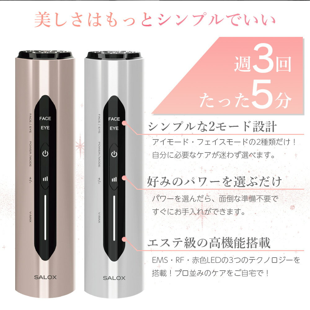 美顔器 SALOX 目元 リフトアップ ems ほうれい線 たるみ 顔 イオン導入 美顔 小顔 マッサージ スキンケア 目の下 フェイス シミ 化粧水 多機能 led 導出 引き締め ホーム エステ 肌荒れ しわ ギフト プレゼント