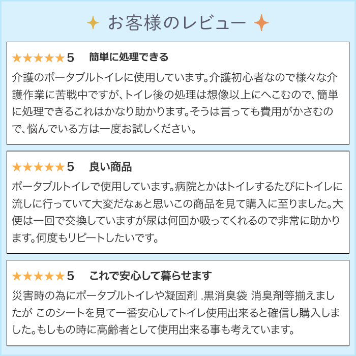 ●サイズ/幅60×長さ84cm●重さ/1.8kg●材質/ポリオレフィン系不織布、綿状パルプ、吸収紙、高分子吸水材、ポリエチレン、他●吸水量/約1000cc●生産国/日本・ポータブルトイレシート使用で便利で簡単・衛生的な排泄処理!・ポータブルトイレにぴったりセット!尿と便をしっかりキャッチ!・バケツ(ポット)の洗浄作業の改善!・気になる尿の排泄音がしない!夜間にも、周りを気にせず、安心してご使用いただけます。・尿を固めてこぼさない!給水ポリマーがブレンドされた綿状パルプ吸収体が素早く尿を固めます。【第一衛材】 【当店では以下のような商品を取り扱っております。】 [食事関連] 介護食 健康食品 栄養補助食品 ハイカロリー 区分1 区分2 区分3 区分4 容易にかめる 歯ぐきでつぶせる 舌でつぶせる かまなくてよい ドリンク お箸 スプーン フォーク グリップ カフ 食器類 すべり止めシート カップ吸い飲み器 調理器具 オーブナー ロ腔ケア用品 食事用エプロン 飲料 飲み物 栄養補助ゼリー ゼリー飲料 自助具 カトラリー コップ お皿 オーラルケア 歯ブラシ 歯ぶらし 歯磨き 入れ歯洗浄 食事用前掛け [入浴関連] シャワーチェア 浴槽台 浴槽手すり 浴槽ポード バスリフト バスマット バスシート シャワーキャリー 入浴用 介助ベルト すのこ 入浴用クッション 防水力バー エプロン 入浴エプロン 介助用エプロン シューズ シャワー付チェア 簡易浴槽 入浴用担架 入浴用小物 入浴剤 清拭料 ボディーソープ シャンプー 保湿剤 清拭タオル 風呂いす お風呂椅子 バスボード シャワー用車いす 入浴介助エプロン お風呂マット 滑り止めマット すべり止め 転倒予防 クッション 業務用入浴剤 ドライシャンプー ウェットタオル [ベッド関連]べッド サイドレール サイドテーブル べッド用手すり カバー 衝撃吸収マット 枕 寝具 エアマット マットレス オーバレイ 介助ベルト 移乗用具 移乗グロープ 介護リフト シーツ 防水 除湿 非防水 べッドバッド 体位変換クッション セーフティー用品 電動ベッド 介護ベッド 介助バー Pバー ピロー 介護クッション ベッド柵 転倒予防 座位保持 端座位 床ずれ用品 褥瘡 除圧 [衣類] 寝巻き 肌着 衣類 紙おむつホルダー 失禁バンツ 防寒具 帽子ソックス サポーター コルセットルームウェア アンダーウェア 下着 トップス ボトムス アウター チュニック ベスト カーディガン 羽織り 寒さ対策 軽失禁パンツ 尿漏れパンツ 靴下 くつした サポーター 腰用 膝用 足用 足首 背中 手首 肩 肘 [歩行関連] 車いす 電動車いす 車いす用クッション 座位保持用具 車いす用小物 スロープ 電動昇降機 歩行車 歩行器 シルバーカー ショッピングカート ウォーキングボール 杖 多点杖 松葉杖 クラッチ 杖小物 ゴムチップ リハビリシューズ 靴下 靴した ソックス スリッパ 室内履き 外履き 入院 施設用 病院用 シューズ シューズ小物 転倒予防 ヘッドガード 車いす用オプション 歩行補助器 四輪 手押し車 カート 買い物カート シニアカー ステッキ 四点杖 4点杖 杖先ゴム 介護シューズ コンフォートシューズ ウォーキングシューズ ヘッドギア 頭部保護帽 帽子 車椅子体重計 [排泄関連]ポータブルトイレ プライベートスクリーン 簡易便座 トイレ用手すり 補高便座 便座シート トイレマット トイレ用雑貨 消臭剤 汚物処理用品 紙おむつ おむつ オムツ パッド 尿取りパッド 尿器 おしり洗浄液 シャワーポトル おしりふき 紙おむつ処理袋 採尿器 差込便器樹脂製トイレ 木製トイレ 家具調トイレ 目隠しスクリーン トイレ用手摺り 補高補助便座 トイレシート 消臭フォーム 消臭スプレー おむつ処理袋 尿漏れパッド サニタリー用品 トイレットペーパー シングル ダブル 使い捨て [住宅改修]玄関台 段差解消スロープ すべり止め小物 取っ手 玄関用へンチ 置き型手すり 玄関用手すり 手すり部材 浴室用手すり 部材段さ解消 滑り止め 上がりかまち 框用 手摺り 踏み台 [日常生活]階段昇降機 立ち上がり補助いす 電動昇降いす 座いす サポートアイテム リーチャー はさみ ルーベ 爪切り 爪やすり 腕時計 助聴器 補聴器 集音器 コミュニケーション機器 見守り 報知装置 ヒーリング座椅子 電動昇降椅子 リクライニングチェア [健康管理]レクリエーションアイテム トレーニングアイテム 平行棒 トレーニングマシン マッサージ機 温冷具 クッション 円座クッション ルームランナー ランニングマシン 電動ウォーカー トレッドミル クロスバイク ぶら下がり健康器 マッサージチェア ビーズクッション 低反発クッション [医療・施設]吸引器 体温計 非接触 血圧計 温湿度計 歩数計 体重計 車いす用体重計 ホットキャビ 回診車 ランドリーカート ボディベッド ゴミ容器 プライベートスクリーン 施設用いす テープル チェスト 床頭台 施設用 畳製品 ストレッチャー 担架 薬カレンダー 薬入れ 薬用小物 点眼用品 腹帯 メディカルケア 保湿クリーム 手袋 使い捨てエプロン マスク 感染対策用品 バッグ お薬手帳カバー衣類 ユニフォーム 疑似体験セットネブ