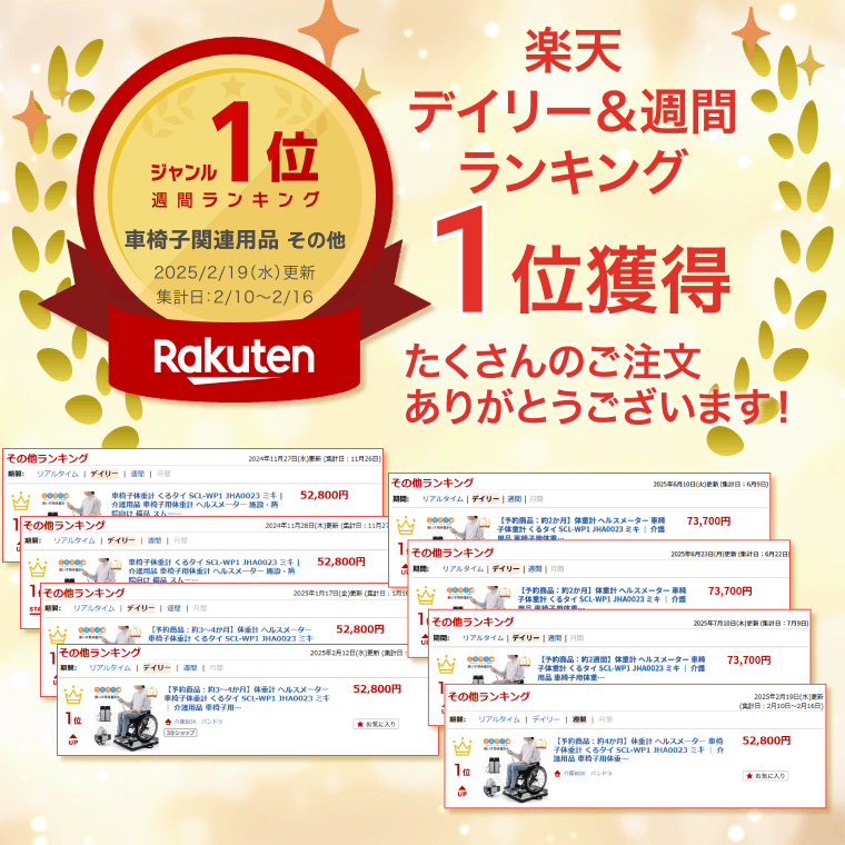 ●外形サイズ/展開時:長さ950×幅730×厚み65mm、折りたたみ時:長さ950×幅375×厚み125mm ※コントローラー無 ●計量部サイズ/長さ660×幅70〜650mm ●スロープ角度/14° ●本体質量/6.4kg、コントローラー:0.2 ●表示/0.5kg単位 ●計量範囲/最大計量 150kg ※車いすの重量を含む、最小計量 1kg ●機能/風袋引き 風袋引きメモリ3個 ●電源/単4電池4本(コントローラー側) ●消費電力/約20mA ●使用環境条件/0℃〜40℃(結露なきこと)、水平な箇所で使用すること ●付属品/コントローラー、接続用カールコード、コントローラーホルダー ・車いすユーザーが一人で自宅で量れる、軽量・コンパクトで折りたたみ可能な車いす用体重計。 ・車いすに乗ったままで、自身の体重を測定できます。 ・車いすユーザー自身が出し入れできるコンパクトで軽い体重計を考案しました。 ・既存の車いす体重計の約半額という買い求めやすい価格に設定しました。 ・乗り降りがスムーズで、風袋引(ふうたいび)き機能により、車いすの重量を自動的に差し引き、体重を表示します。 ・薄型の測定台には、14°のスロープが装備。 段差が少ないため、乗り降りが非常にスムーズに行えます。 ・操作は手元のコントローラーだけで簡単に行えます。 ・片手でセット・収納ができる軽量モデル。 ・持ち運びが容易で、すぐに体重測定の準備ができます。 ・使用しないときは、コントローラーを本体に収めて、コンパクトに折りたたんで収納できます。 【ミキ】車いす用体重計 くるタイ その他おすすめはこちら 車いす用体重計(検定品) PW-650A タニタ 車いす用体重計 ヘルスアシスト HA-4J グループアシスト 移動用リフト リーチ(電動式) モルテン その他「車椅子用体重計、精密体重計」はこちら ≫