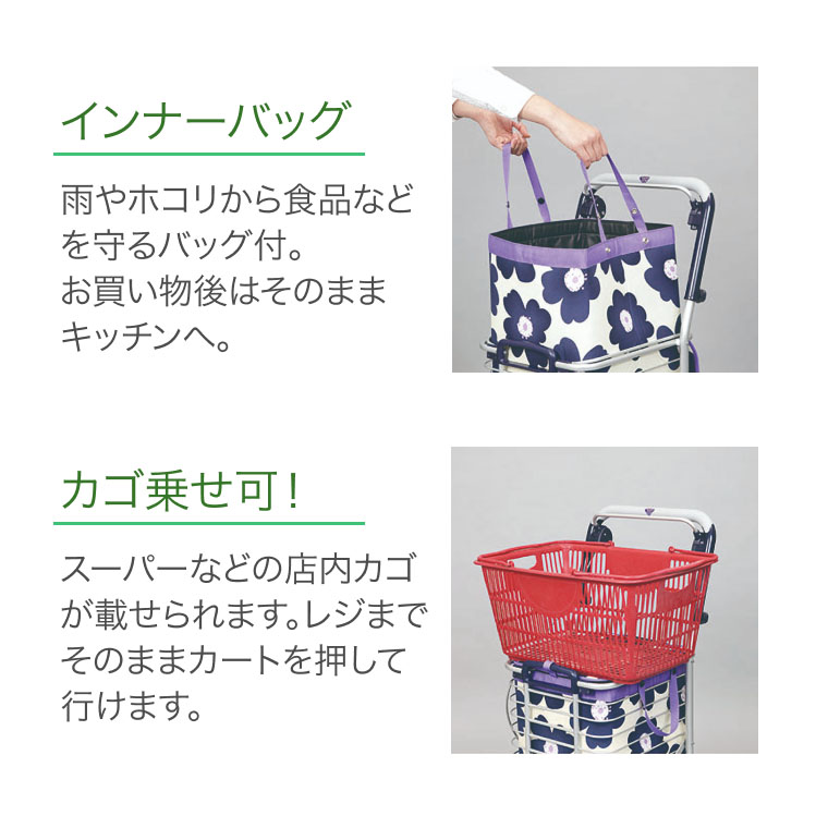 ●サイズ/幅48.5×奥行49.5×高さ88〜98cm、折りたたみ時:幅48.5×奥行27×高さ78〜88cm●車輪サイズ/前輪15×後輪17cm●重さ/4.9kg●バッグ容量/約30L●バッグ積載荷重/20kg●材質/本体:アルミニウム●生産国/日本●標準機能/折りたたみ式、ハンドル高さ調整(3段階/約5cmピッチ)、手元ブレーキ・手元駐車ストッパー●SGマーク取得商品 ・使う人が楽しく、楽に使えるカートです。 ・見た目にも華やかな花柄インナーバッグと、シンプルなデザインを好まれる方に人気のメッシュ紺の3色展開です。 ・強くて軽いアルミフレームで快適なショッピングができるようサポートします。 ・手元を握ればブレーキ、押し下げれば停車ストッパーになる簡単操作のワイヤーカート。 ・インナーバッグ付きカートです。雨やホコリから食品などを守ることができます。お買物の後はインナーバッグだけ取り外し、そのままキッチンへ持ち運ぶのにも便利です。 ・スーパーなどの店内お買物カゴを載せることができます。レジまでそのままカートを押して歩けるので、ショッピングにも便利です。 ・お誕生日や母の日、父の日、敬老の日などのプレゼントにも喜ばれています。(梱包サイズの兼ね合いにより、ラッピングやのし対応を承ることができません。ご容赦くださいませ。) ※自立歩行が困難な方向けの商品ではございません。 【ユーバ産業】 【当店について】 当店は高知県に所在している介護用品や福祉用具をメインに取り扱っているショップです。在庫品もたくさんご用意しています。各エリアに倉庫拠点を置き、全国のお客様へいち早くお届けできるよう在庫を取り揃え、配送までの日数を極力お待たせすることないよう体制を整えています。(各メーカーから直送させていただいたり、メーカーより取り寄せ後発送する商品もございます)シニア層のお客様に人気のある商品や、介護現場での必要不可欠なグッズ、アイディア用品、便利グッズなどもご用意しており、ご好評いただいています。紙オムツなど医療費控除対象商品も数多く取り揃え、一度にたくさん購入が必要な場合は、ケース出荷での対応も行っております。まとめ買いや大量購入、病院や施設での備蓄にとお買い求めいただいています。ご購入前にお見積りのご要望がございましたら、作成もご相談受け付けておりますので、お気軽にお問い合わせください。 【当店では以下のような商品を取り扱っております。】 [食事関連] 介護食 健康食品 栄養補助食品 ハイカロリー 高カロリー 区分1 区分2 区分3 区分4 容易にかめる 歯ぐきでつぶせる 舌でつぶせる かまなくてよい ドリンク お箸 スプーン フォーク グリップ カフ 食器類 すべり止めシート カップ吸い飲み器 調理器具 オーブナー ロ腔ケア用品 食事用エプロン 飲料 飲み物 栄養補助ゼリー ゼリー飲料 自助具 カトラリー コップ お皿 オーラルケア 歯ブラシ 歯ぶらし 歯磨き 入れ歯洗浄 食事用前掛け [入浴関連] シャワーチェア 浴槽台 浴槽手すり 浴槽ポード バスリフト バスマット バスシート シャワーキャリー 入浴用 介助ベルト すのこ 入浴用クッション 防水力バー エプロン 入浴エプロン 介助用エプロン シューズ シャワー付チェア 簡易浴槽 入浴用担架 入浴用小物 入浴剤 清拭料 ボディーソープ シャンプー 保湿剤 清拭タオル 風呂いす お風呂椅子 バスボード シャワー用車いす 入浴介助エプロン お風呂マット 滑り止めマット すべり止め 転倒予防 クッション 業務用入浴剤 ドライシャンプー ウェットタオル [ベッド関連]べッド サイドレール サイドテーブル べッド用手すり カバー 衝撃吸収マット 枕 寝具 エアマット マットレス オーバレイ 介助ベルト 移乗用具 移乗グロープ 介護リフト シーツ 防水 除湿 非防水 べッドバッド 体位変換クッション セーフティー用品 電動ベッド 介護ベッド 介助バー Pバー ピロー 介護クッション ベッド柵 転倒予防 座位保持 端座位 床ずれ用品 褥瘡 除圧 [衣類] 寝巻き 肌着 衣類 紙おむつホルダー 失禁バンツ 防寒具 帽子ソックス サポーター コルセットルームウェア アンダーウェア 下着 トップス ボトムス アウター チュニック ベスト カーディガン 羽織り 寒さ対策 軽失禁パンツ 尿漏れパンツ 靴下 くつした サポーター 腰用 膝用 足用 足首 背中 手首 肩 肘 [歩行関連] 車いす 電動車いす 車いす用クッション 座位保持用具 車いす用小物 スロープ 電動昇降機 歩行車 歩行器 シルバーカー ショッピングカート ウォーキングボール 杖 多点杖 松葉杖 クラッチ 杖小物 ゴムチップ リハビリシューズ 靴下 靴した ソックス スリッパ 室内履き 外履き 入院 施設用 病院用 シューズ シューズ小物 転倒予防 ヘッドガード 車いす用オプション 歩行補助器 四輪 手押し車 カート 買い物カート シニアカー ステッキ 四点杖 4点杖 杖先ゴム 介護シューズ コンフォートシューズ ウォーキングシューズ ヘッドギア 頭部保護帽 帽子 車椅子体重計 [排泄関連]ポータブルトイレ プライベートスクリーン 簡易便