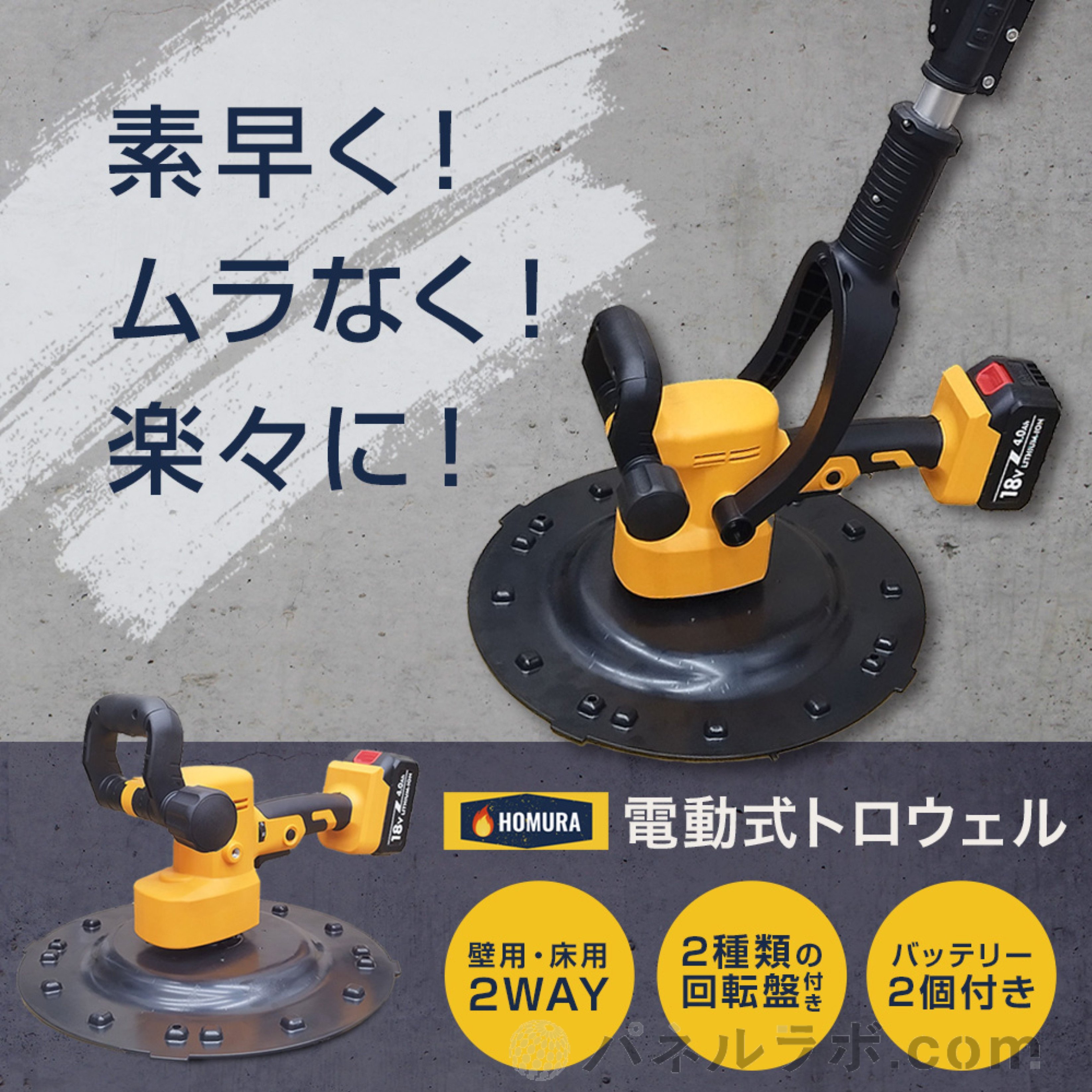 品名HOMURA 電動式トロウェル dkt-zx01y定格電力72Wh定格電圧18Vバッテリー容量4.0Ah無負荷速度80-200回転 /分速度調整6段階連続使用時間1速(一番遅い速度):約3.5時間 6速(一番速い速度):約1時間回転直径380mm寸法(mm)本体:長さ約485×高さ約255 延長ハンドル:長さ約915~1480×径約32製品重量本体:約3.3kg 延長ハンドル:約1.2kg 樹脂回転盤:約0.35kg 鉄製回転盤:約0.98kg梱包寸法(mm)本体:約395×395×230 延長ハンドル:約820×135×115梱包重量計:10.7kg(本体:約9.1kg 付属品:1.6kg)同梱ネジ材質亜鉛メッキ加工保証について6か月特徴建築現場で大活躍!左官作業も電動式トロウェルを使って作業効率UP!付属の延長ハンドルで床面コンクリート均しも楽々!軽量で現場への持ち運びもしやすい!マキタ互換バッテリ2個付属!注意事項●本体の使用には支障のない場所に手書き数字が記入されています。これは品質管理のためのものです。予めご了承ください。 ●この商品は到着後、簡易組み立てが必要です。 ●沖縄、離島地域へは配送できません。 ●仕様は予告なく変更する場合があります。 ●ディスプレイ画面等の環境上、写真と実際の商品の色とは多少違う場合がございます。 ●ご使用前に付属の「取扱説明書」と「安全上のご注意」のすべてをお読みの上、正しく使用してください。感電、火災、けがなどの事故を未然に防ぐために「安全上のご注意」を必ず守ってください。 ●当製品にマキタ純正バッテリーを使って稼働させることは確認できております。他社バッテリーでは装着等スムーズではないこともございます。予めご了承ください。 ●当製品は付属の専用バッテリー使用を推奨しております。製品保証は付属の専用バッテリー使用時のみ対象となります。 他社バッテリーを使用の場合は対象外となりますので予めご理解、ご了承のほどよろしくお願いいたします。 ●こちらの商品は実店舗でも販売しております関係上、ご購入のタイミングによっては品切れが発生する場合もございます。 大変恐れ入りますが、その場合はキャンセル対応をさせていただきますこと、予めご了承ください。箱数2箱(本体、延長ハンドル)HOMURA 電動式トロウェルパネルラボはHOMURAの公式ストアです。 HOMURAは、安心の国内在庫と国内対応! 受注後2営業日以内に発送!(在庫切れの場合は入荷次第、順次発送いたします) ・モルタルやセメント仕上げの凸凹を取り除きます。 ・効率よく広い面積の土間コンクリートを平らにします。 ・軽量により、作業者への負担が軽減されます。 延長ハンドルの持ち手および本体との接続部のカラーを黒色から【黄色】に変更いたしました。 ※商品画像は旧カラーの黒色です。 HOMURAはパネルラボでのみ取り扱いをしております。他店舗で類似ページの商品がございますが、当社のHOMURAとは一切関係がありません。ご購入時にはご注意ください。ランキング受賞しました!素早く!ムラなく!楽々に!壁面、床面に使用できる2WAY仕様です。2種類の回転盤とバッテリー2個が付属しています。 延長ハンドルの持ち手および本体との接続部のカラーを黒色から【黄色】に変更いたしました。※商品画像は旧カラーの黒色です。楽に作業ができると大好評!コンパクトで扱いやすい!延長ハンドルの持ち手および本体との接続部のカラーを本体の基本色に合わせて黒色から【黄色】に変更いたしました。※商品画像は旧カラーの黒色です。延長ハンドルの持ち手および本体との接続部のカラーを黒色から【黄色】に変更いたしました。※商品画像は旧カラーの黒色です。選べる!付属の延長ハンドル通常価格に+3,000円で手元操作可能な延長ハンドルに変更できます。手元操作が可能な延長ハンドルでさらに作業効率アップ!当製品にマキタ純正バッテリーを使って稼働させることは確認できております。 他社バッテリーでは装着等スムーズではないこともございます。予めご了承ください。 当製品は付属の専用バッテリー使用を推奨しております。製品保証は付属の専用バッテリー使用時のみ対象となります。 他社バッテリーを使用の場合は対象外となりますので予めご理解、ご了承のほどよろしくお願いいたします。箱と取扱説明書はHOMURAオリジナルです本体はオリジナルデザインボックスです。1セットにつき2個口でお届けします。安心の日本語取扱説明書付きで、組み立て方法を日本語で詳しく説明しています。連続使用時間は1速(一番遅い速度)で約3.5時間、6速(一番速い速度)で約1時間です。 同梱ネジの材質は亜鉛メッキ加工です。 延長ハンドルの持ち手および本体との接続部のカラーを本体の基本色に合わせて黒色から【黄色】に変更いたしました。 関連商品はこちら即日発送可!【送料無料】 最新 改良型 ...HOMURA 専用 電動式トロウェル 鉄盤 2枚...HOMURA 専用 電動式トロウェル 樹脂盤 5...