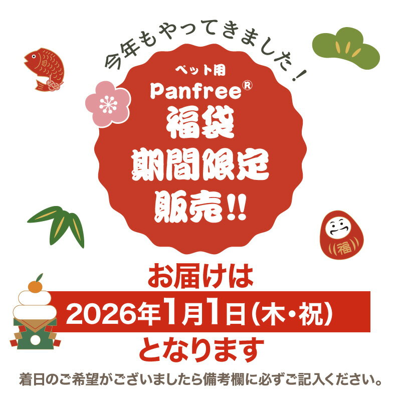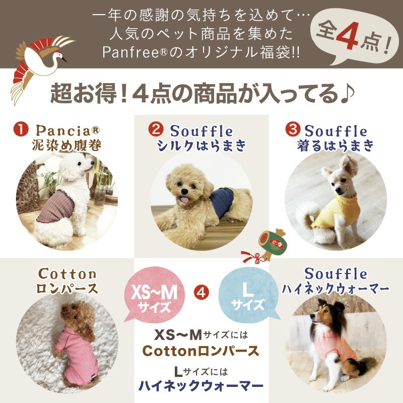 2026 Panfree® 福袋 商品説明 今年もやってきました!Panfree®の2026年福袋です。シルク生地を扱う当ショップの人気腹巻やシルクの高品質ウエアなど、全4点が入っています。1年の感謝の気持ちを込めたとってもお得な福袋となっております。期間限定のご予約販売となりますので是非、お見逃しなく! 素材 Pancia®泥染め腹巻 シルク 80%・ナイロン 20% Souffle シルク腹巻 シルク 65%・ナイロン 35% Souffle 着るはらまき シルク 65%・ナイロン 35% Cotton ロンパース シルク 55%・ナイロン 45% Souffle ハイネックウォーマー ※Lサイズ限定 シルク 65%・ナイロン 35% 適応サイズ XSサイズ (レギュラー):胴周23〜30cm/着丈20〜27cm Sサイズ (ショート):胴周30〜37cm/着丈27〜32cm (レギュラー):胴周30〜37cm/着丈31〜34cm (ロング):胴周30〜37cm/着丈33〜40cm Mサイズ (ショート):胴周35〜50cm/着丈30〜35cm (レギュラー):胴周35〜50cm/着丈34〜38cm (ロング):胴周35〜50cm/着丈39〜47cm Lサイズ (ショート):胴周50〜70cm/着丈34〜47cm (レギュラー):胴周50〜70cm/着丈48〜65cm 生産国 日本 カラー ランダム 予約受付期間 2025年12月15日(月) am8:59までのご注文で【1月1日(木)お届け】 注意 ・他の商品と合わせてご購入できません。 ・返品交換不可 アイテム名 福袋 ペット用腹巻き シルク腹巻 犬用 猫用 腹まき はらまき 腹巻き 犬用腹巻き 猫用腹巻き ペット用着る腹巻き シルク着る腹巻 着る腹まき 着るはらまき 着る腹巻き 犬用着る腹巻き 猫用着る腹巻き 犬 猫 ペット ドッグウェア キャットウェア 着せやすい 温かい 寒がり 伸縮自在 色違い 用途 冷え取り 冷え対策 冷え予防 花冷え 防寒 アンダーウエア インナー お肌の保護 お腹の保護 下痢 術後着 皮膚病 換毛期 肌が弱い 敏感肌用 免疫 腸活 ヘルニア予防 プレゼント ペット温活 犬温活 猫温活 冷房対策 クーラー対策 梅雨寒対策 寒暖差 夏の冷え対策 蒸れにくい 冬の冷え対策 寒い日用 防寒着 ペットの防寒着 寒暖差 床冷え 洗濯方法 洗濯機・乾燥機をご使用いただけます。お洗濯の際はネットに入れ、中性洗剤をご使用ください。長時間乾燥はお避け下さい。外干しの場合は陰干ししてください。