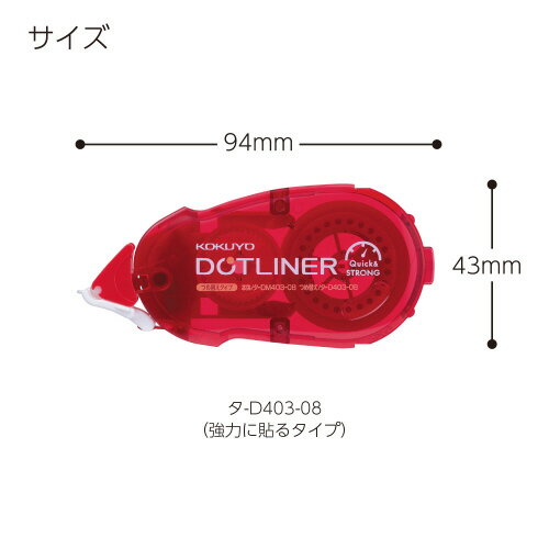 ●大量の書類も強力瞬間封とじ。反発に強い、強力タイプのドットライナー●粒状になったのりを使用したドットタイプのテープのり。糸ひきがなく、ピタッとキレイに塗れます。●テープ状ののりなので、ベタつかず、乾く時間を待たずに接着でき、手やまわりも汚しません。もちろん紙がシワにならず、仕上がりもキレイ!●先端にローラーを採用。軽い引き心地と確実なのり付けで、作業がスムーズに進みます。●写真や紙の変色の原因となる酸を抑えたのりを採用。スクラップブッキングにも最適です。●環境に配慮した非溶剤系のりを採用。ケースに再生樹脂を使用した、エコマーク取得商品です。●ポップアップ式でつめ替えが簡単。テープの長さはたっぷり16mで、最後まできっちり使えます。もちろんテープは交換式なのでとても経済的です。テープ寸法(幅・長さ):8.4mm・16m 仕様:瞬間強粘着・タ-DM403-08用 ●材質/つめ替えケース:R-PS ●ACID FREE●大量の書類も強力瞬間封とじ。反発に強い、強力タイプのドットライナー●粒状になったのりを使用したドットタイプのテープのり。糸ひきがなく、ピタッとキレイに塗れます。●テープ状ののりなので、ベタつかず、乾く時間を待たずに接着でき、手やまわりも汚しません。もちろん紙がシワにならず、仕上がりもキレイ!●先端にローラーを採用。軽い引き心地と確実なのり付けで、作業がスムーズに進みます。●写真や紙の変色の原因となる酸を抑えたのりを採用。スクラップブッキングにも最適です。●環境に配慮した非溶剤系のりを採用。ケースに再生樹脂を使用した、エコマーク取得商品です。●ポップアップ式でつめ替えが簡単。テープの長さはたっぷり16mで、最後まできっちり使えます。もちろんテープは交換式なのでとても経済的です。テープ寸法(幅・長さ):8.4mm・16m 仕様:瞬間強粘着・タ-DM403-08用 ●材質/つめ替えケース:R-PS ●ACID FREE