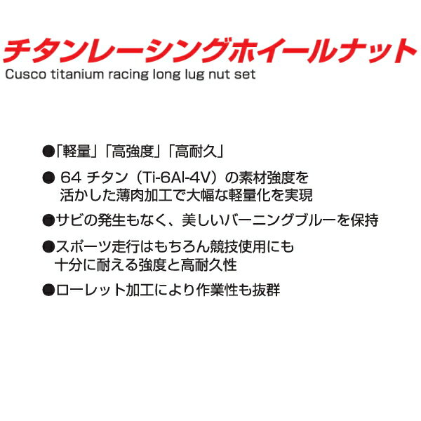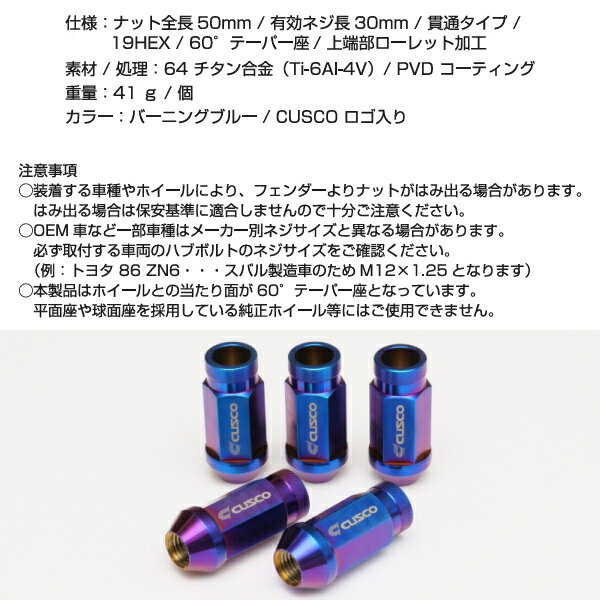 CUSCOチタンレーシングホイールナット 貫通タイプ 20個/1セット19HEX 全長50mm ネジサイズM12×P1.5 バーニングブルー