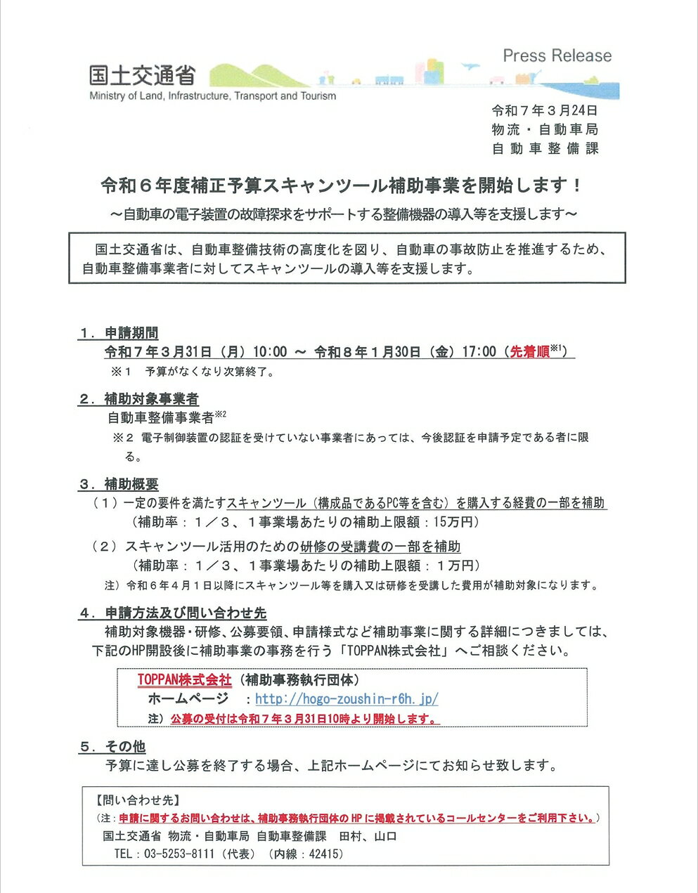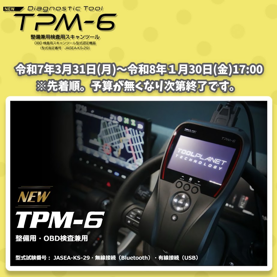 ◎TOPIX 【TPM-6はISO13400対応機種です】 ISO13400は、車両の電子制御ユニット(ECU)診断のための通信プロトコルであるDoIPの国際標準規格です。 2025年10月1日からは輸入車を対象にOBD検査が開始され、ISO13400に対応したスキャンツールが必要になります。 (メルセデスベンツ・ボルボ・三菱ふそうなど) ◎TOPIX 2025年3月27日 令和6年度補正予算スキャンツール補助事業を開始します。 国土交通省は、自動車整備技術の高度化を図り 自動車の事故防止を推進するため 自動車整備事業者に対してスキャンツールの導入の支援をします。 【申請期間】 令和7年3月31日(月)~令和8年1月30日(金)17:00(先着順) ※予算がなくなり次第終了。 ※詳細は3枚目画像をご参照ください。 【商品詳細】 ・メーカー:ツールプラネット(TOOLPLANET) ・商品品番:TPM-6(TPM-5後継品番) ・JANコード:4573151700137 ・数量:1台 【商品説明】 ~NEW Diagnostic Tool~ TPM-6 整備兼用検査用スキャンツール 《OBD 検査用スキャンツール型式認定機器》(型式指定番号:JASEA-KS-29) OBD検査モード(Dolp接続可能)を標準装備! Bluetoothを搭載し、OBD検査を無線通信で実行! あらゆる機能を集約した整備兼用スキャンツールがデビュー! NEW1 次世代通信(ISO13400)に対応【Dolp(Ethernet=イーサネット)対応】 NEW2 無線による自由度の高いOBD検査を実現【Bluetootrh(ブルートゥース)搭載】 NEW3 整備モードと検査モードをワンタッチで切り替え【J2534モードと整備用をすぐさまスイッチ】 NEW4 ファンクションキーが快適操作を実現【診断結果をスピーディに確認】 NEW5 車両制御履歴を検出し、クルマの状態を診断【車両制御履歴RoB】 ◎多彩なオプション機能 ・診断機能 ・アクティブテスト ・データモニタ ・フリーズフレーム ◎現代の特定整備に欠かせない特殊機能の数々 ・簡易バッテリーテスト ・エーミングモード ・メンテナンスモード ・DPF ◎進化を続けるTPMの新機能 ・Wi-Fiアップデート ・車両登録機能 ・ファンクションキー搭載 ・エアコン整備機能 ★1年間無償のアップデート 定期的にアップデートすることで常に最新バージョンの状態でご利用頂けます。 尚、無償アップデート期間終了後1か月以内にソフトのアップデートをして頂くと本体保証も自動的に継続となります。 ※ご購入後は、ユーザー登録が必要です。インターネット接続ができるPC環境をご準備下さい。 ★診断レポート作成(EASYREPORT+) 診断結果のレポート作成が簡単に行えるEASYREPORT+を提供しています。 面倒なレポート作成もこれでスッキリ解決! スキャンツールは車両に接続して車内に置いたまま、ご使用のスマートフォンやタブレットで操作が行えます。 ※iOS版及びAndroid版をご用意しております。