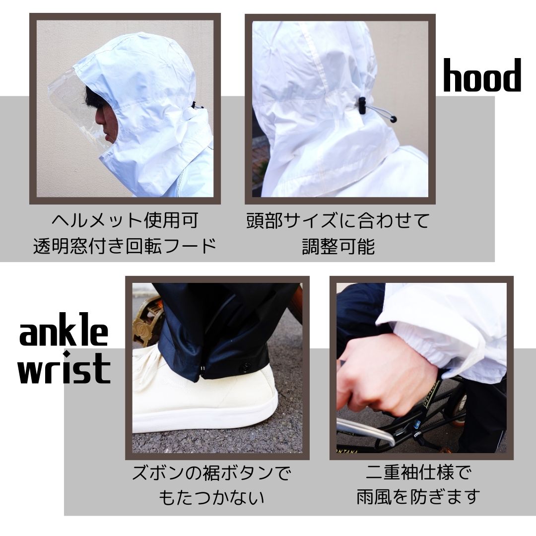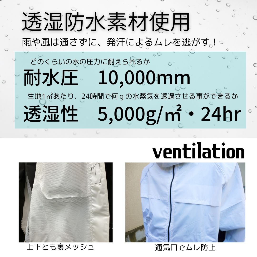 商品名 透湿 防水 レインスーツ 素 材 >表 ポリエステル100%/TPU(PUラミネート)・裏 ポリエステル100%(メッシュ) カラー ホワイト/ブラック サイズ S〜5L 重さ 重さ:LLサイズで約920g*** 透湿 防水 レインスーツ *** 通勤や通学、アウトドア活動など、さまざまなシーンで活躍するレインスーツ。 雨の日のストレスを軽減し、快適な一日をサポートします。 重くて蒸れやすいカッパは嫌!! 軽くて快適な着心地のレインスーツに変えてみませんか? 耐水圧10,000mm・透湿性 5,000g/m2,24hr 生地は蒸れにくい透湿素材 裏はメッシュ生地になっており、ベタ付かず快適な着心地です。 胸部分にはベンチレーションもがあるので更に内側のムレを逃します。 軽量で着心地快適。 重さ:LLサイズで約920g 背中にリュックを背負ったまま着れるマチ付♪ 丈が長めの作りになっているので、大きなリュックでも下までスッポリと覆えて 雨の侵入を防ぐことができます。 ヘルメット対応フードで、ヘルメットの上からもすっぽり被ることが出来ます。 回転フードで視界もバッチリ! 収納袋付き 【レビュープレゼントキャンペーン】 *こちらはプレゼント対象商品です* ※離島等一部地域は送料が追加となる場合がございます。 ※製造時期によって色味や部品・パーツの仕様等が若干異なる場合がございます。 ※モニターの違いにより、実際のカラーと異なる場合がございます。 ※当店使用の画像転用・記載文章の転載は固くお断りします。