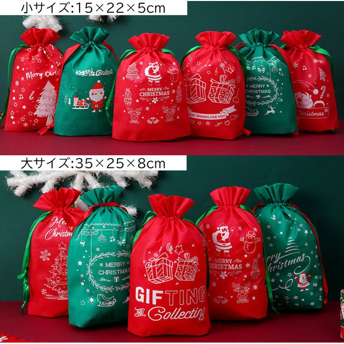 2枚セット クリスマス 巾着 不織布 サイズ2種 赤 緑 大きめ 大きい 小さめ 小さい ラッピング 袋 クリスマス プレゼント用 ラッピング用品 梱包 包装 贈り物 おしゃれ かわいい サンタ トナカイ 雪だるま サンタクロース マチあり