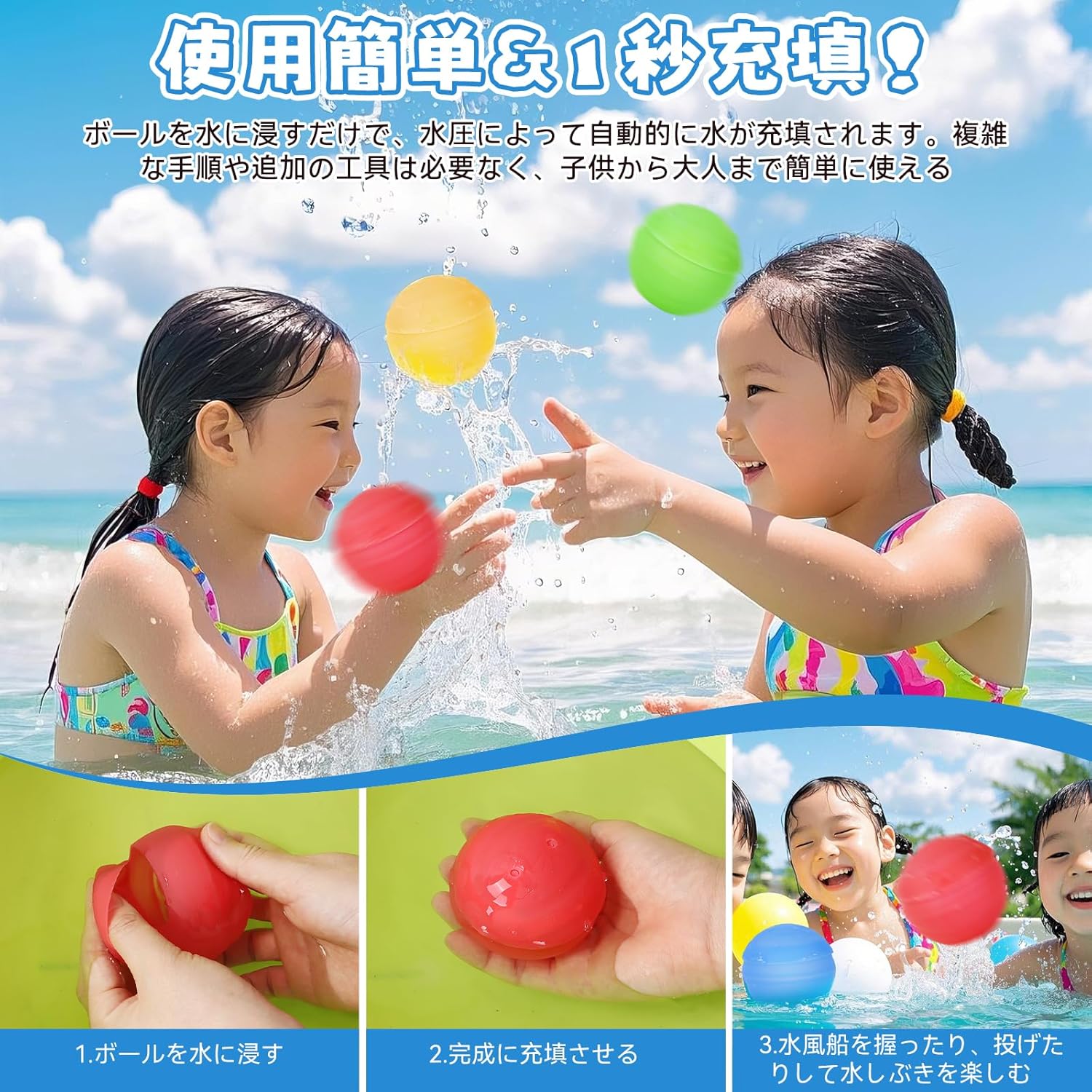 スプラッシュボール プールおもちゃ 水遊びグッズ 繰り返し使える水風船 大量 シリコン製 安全 柔らかい 痛みなし 外遊び玩具 お風呂玩具 水風船合戦 夏祭り 夏休み 縁日 お祭り 子供向け 家庭用 小学生 使用簡単 夏まつりのギフト