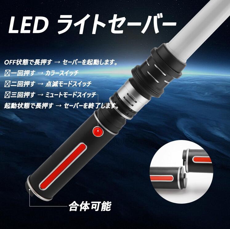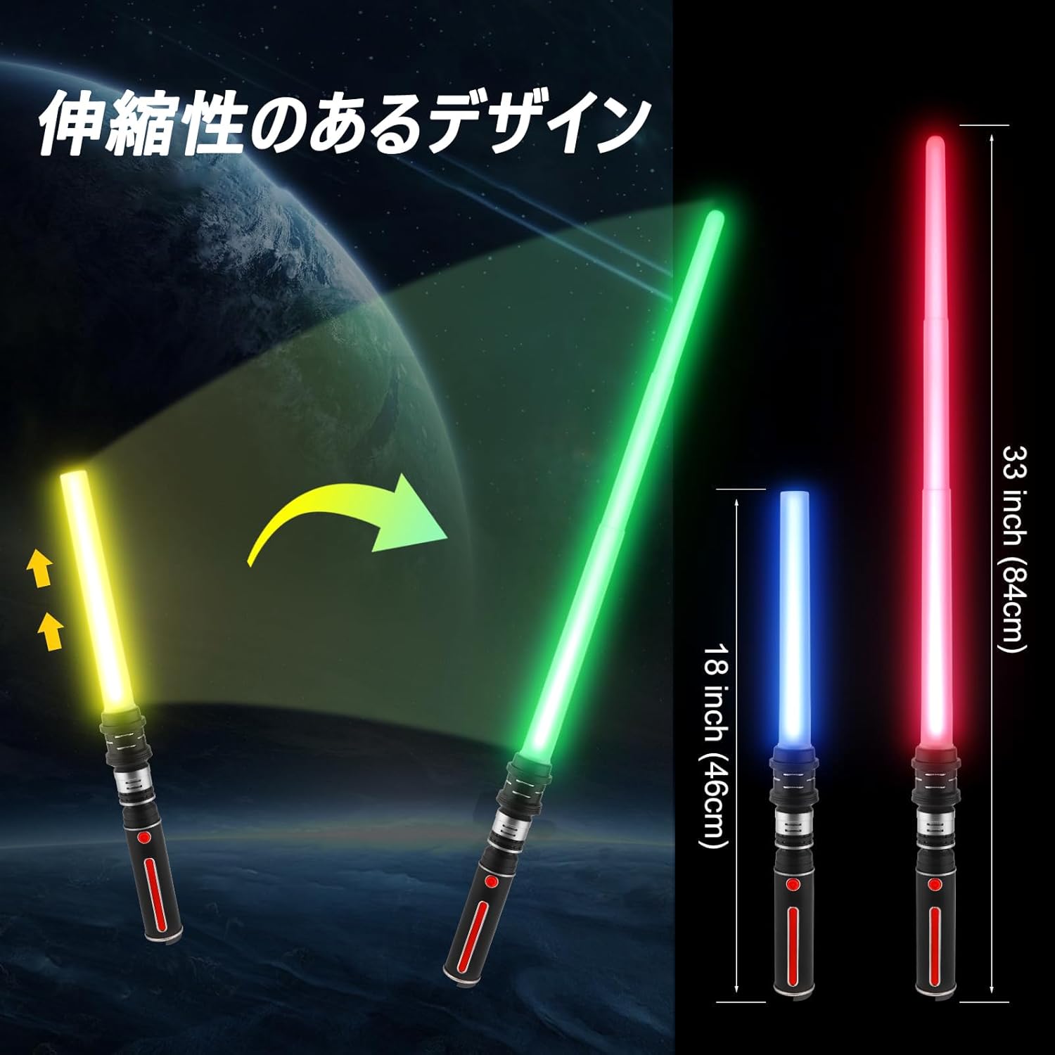 商品情報【12色に変化+効果音】電源ボタンを押すごとに光る、LEDライトセーバーです。ライトには、常灯モードと点滅モードの2種類の変化があります。電源ボタンを押すごとに色が切り替わり、効果音が流れます。リアルな音響効果により、まるで映画の中にいるかのような臨場感を体験できます。【合体可能】2本セットですので、特殊なコネクターデザインを採用したライトセーバーの底部を使って、2本のセーバーを連結して遊ぶことができます。二刀流でも遊べるし、合体させダースモールのライトセーバーのようにすることもできます。【スケーラブルな設計】ライトセーバーは伸縮構造になっており、伸ばしていない時は携帯に便利で、伸ばすと全長84cmになります。【さまざまなシーンで大活躍】このLEDライトセーバーは、子供の遊びやコスプレに最適なアイテムです。贈り物や特別なイベントに最適で、クリスマスプレゼント用、子供やコスプレ愛好者の想像力をかき立てます。LED ライトセーバー 12色 光る剣 伸縮式 合体可能 2本セット 光る刀 コスプレ 子供 クリスマスプレゼント 撮影用小道具 光るソード 光るおもちゃ 誕生日 レゼント led LED ライトセーバー 12色 光る剣 伸縮式 合体可能 2本セット 光る刀 コスプレ 子供 クリスマスプレゼント 撮影用小道具 光るソード 光るおもちゃ 誕生日 レゼント led 【12色に変化+効果音】電源ボタンを押すごとに光る、LEDライトセーバーです。ライトには、常灯モードと点滅モードの2種類の変化があります。電源ボタンを押すごとに色が切り替わり、効果音が流れます。リアルな音響効果により、まるで映画の中にいるかのような臨場感を体験できます。【合体可能】2本セットですので、特殊なコネクターデザインを採用したライトセーバーの底部を使って、2本のセーバーを連結して遊ぶことができます。二刀流でも遊べるし、合体させダースモールのライトセーバーのようにすることもできます。【スケーラブルな設計】ライトセーバーは伸縮構造になっており、伸ばしていない時は携帯に便利で、伸ばすと全長84cmになります。【さまざまなシーンで大活躍】このLEDライトセーバーは、子供の遊びやコスプレに最適なアイテムです。贈り物や特別なイベントに最適で、クリスマスプレゼント用、子供やコスプレ愛好者の想像力をかき立てます。 5