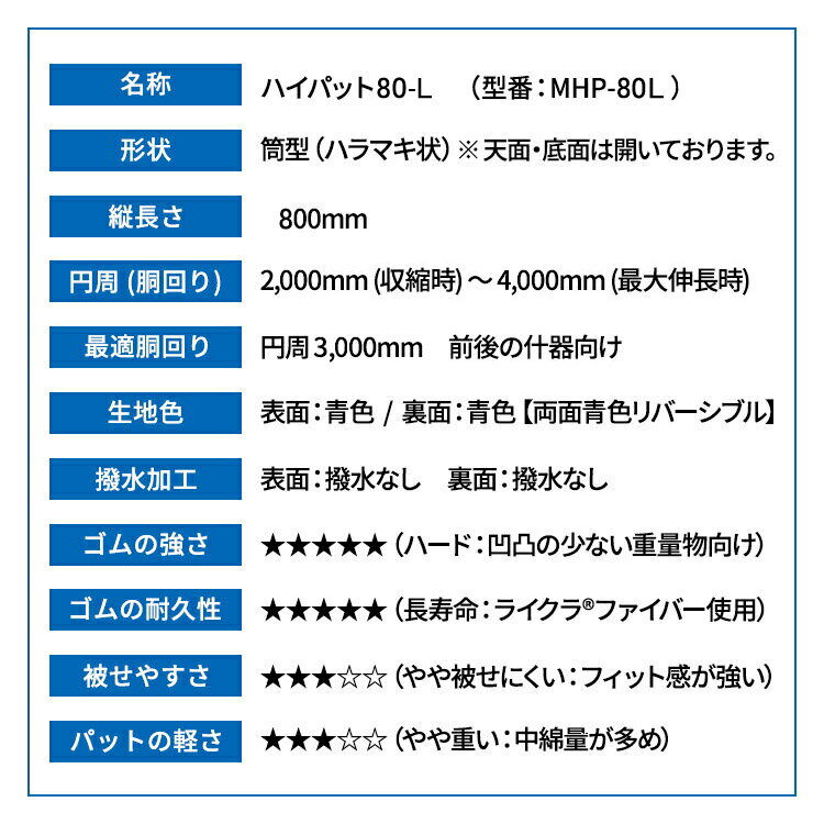 ※ 本製品は、筒型の横方向(円周方向)に伸縮する「輸送用の什器保護カバー」です。(天面・底面は開いております。) ▼ 画像クリックで拡大(モニターの発色や光の具合により、実際の色味と少し異なって見える場合があります。) 引越し・物流のロングセラー商品「ハイパット」 被せるだけで誰でもプロの梱包。 什器の形状や大小に関係なく、広げて被せるだけで初心者でもプロの梱包ができます。 繰り返して使えて省資源。ゴミが出ない。 ハイパットは丈夫で長持ち。使い捨て資材とは異なり、繰返して使えて経費削減に。 現場作業のスピードアップに。 カッターやテープを使わずゴミも出ないので、パッと被せて・サッと開梱。(※ 写真は "ハイパット110-L" を2枚使用) 製品仕様:ハイパット 80-L【型番:MHP-80L 】サイズ表はこちら 特徴 ハードゴム仕様 【ゴムの耐久性重視タイプ】 形状 筒型(ハラマキ状)※ 天面・底面は開いております。 縦長さ 800mm 円周 (胴回り) 2,000mm (収縮時) ~ 4,000mm (最大伸長時) 最適胴回り 円周 3,000mm 前後の什器向け 生地色 表面:青色 / 裏面:青色【両面青色リバーシブル】 撥水加工 表面:撥水なし 裏面:撥水なし ゴムの強さ ★★★★★(ハード:凹凸の少ない重量物向け) ゴムの耐久性 ★★★★★(長寿命:ライクラ®ファイバー使用) 被せやすさ ★★★☆☆(やや被せにくい:フィット感が強い) パットの軽さ ★★★☆☆(やや重い:中綿量が多め) ※ ライクラ®(LYCRA®)は The LYCRA Company の商標です。 ※ ハイパット/エコパット/ニューパット/エアーパットは岡葉流通(株)の登録商標です。引越業界のロングセラー商品で、繰返し使える 梱包材。 東レ・グループの伸縮が長持ちするライクラ®ファイバーを 使用して「物流プロ向け」に従来品よりタフな伸縮力を 実現しました。素早く・手早く・簡単に梱包養生。 類似品にご注意ください。⇒【商標「ハイパット」等の使用に関するお願い】 近年、色やサイズが似ている類似品が数多く出回っておりますが、品質や仕様が全く異なります。 登録商標®をご確認の上「ハイパット®」をご指名下さい。