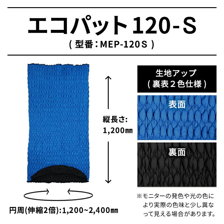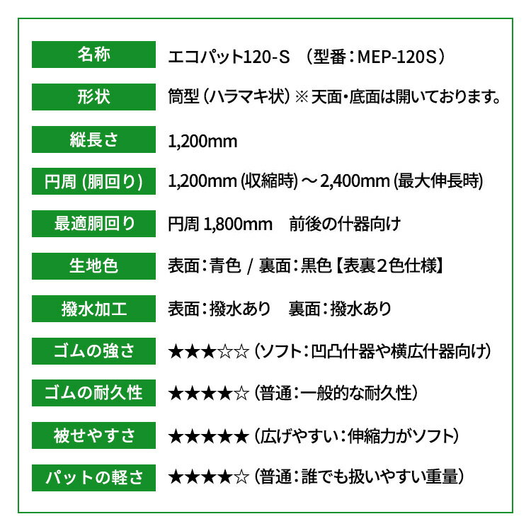 ※ 本製品は、筒型の横方向(円周方向)に伸縮する「輸送用の什器保護カバー」です。(天面・底面は開いております。) ▼ 画像クリックで拡大(モニターの発色や光の具合により、実際の色味と少し異なって見える場合があります。) 製品仕様:エコパット 120-S【型番:MEP-120S 】サイズ表はこちら 特徴 ソフトゴム仕様 【作業性重視の被せ易いタイプ】 形状 筒型(ハラマキ状)※ 天面・底面は開いております。 縦長さ 1,200mm 円周 (胴回り) 1,200mm (収縮時) ~ 2,400mm (最大伸長時) 最適胴回り 円周 1,800mm 前後の什器向け 生地色 表面:青色 / 裏面:黒色【表裏2色リバーシブル】 撥水加工 表面:撥水あり 裏面:撥水あり ゴムの強さ ★★★☆☆(ソフト:凹凸什器や横広什器向け) ゴムの耐久性 ★★★★☆(普通:一般的な耐久性) 被せやすさ ★★★★★(広げやすい:伸縮力がソフト) パットの軽さ ★★★★☆(普通:誰でも扱いやすい重量) ※ ハイパット/エコパット/ニューパット/エアーパットは岡葉流通(株)の登録商標です。 多業界でご愛用の什器保護カバー 「エコパット」 被せるだけで誰でもプロの梱包。 什器の形状や大小に関係なく、広げて被せるだけで初心者でもプロの梱包ができます。 繰り返して使えて省資源。ゴミが出ない。 エコパットはサイズが豊富。使い捨て資材とは異なり、繰返して使えて経費削減に。 現場作業のスピードアップに。 カッターやテープを使わずゴミも出ないので、パッと被せて・サッと開梱。(※ 写真は "エコパット80-M" を使用)伸縮率200%の繰返し使えるキルティング梱包材。 被せるだけで、初心者でもプロの梱包が可能です。 雨・汚れに強い撥水効果に、表裏2色の両面仕様。 多彩な4色で、用途に合わせて使い方いろいろ。