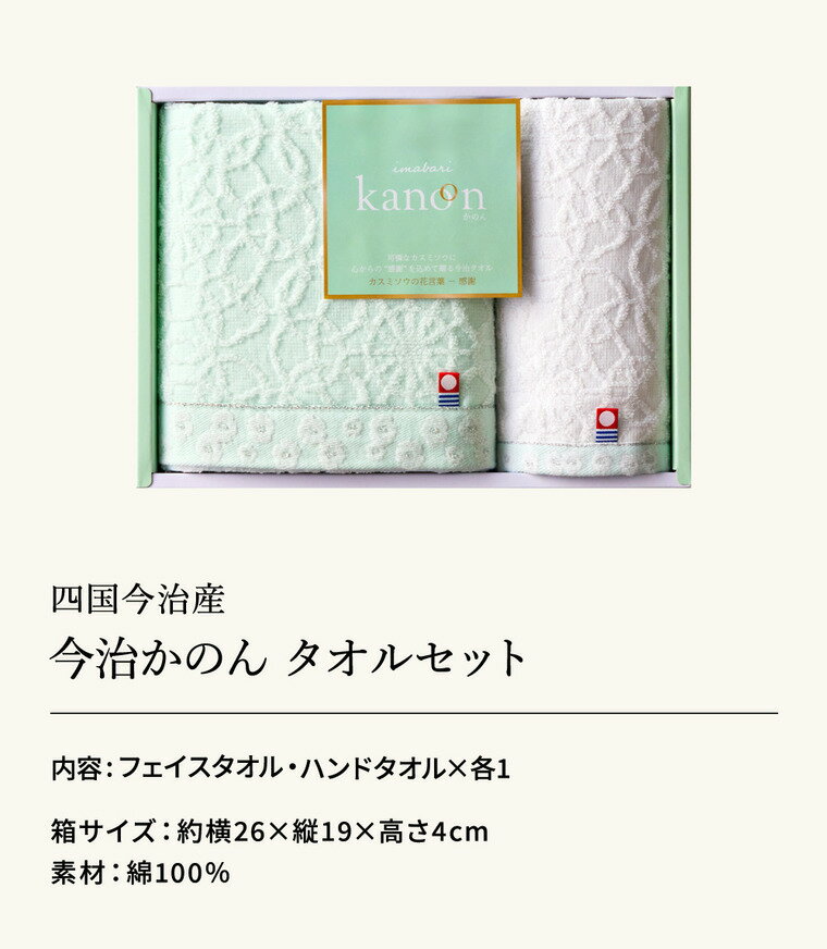 ● のしや包装紙などは購入手続き中に選択できます。● 配送日指定可。 商品詳細 今治タオル 今治かのん タオルセット SPEC ●内容:フェイスタオル×1、ハンドタオル×1 ●サイズ:(フェイスタオル)約34×75cm、(ハンドタオル)約34×34cm ●箱サイズ:約横26×縦19×高さ4cm ●素材:綿100%、日本製 メーカー希望小売価格はメーカーカタログに基づいて掲載しています。 ■さまざまなギフトアイテムをご用意しております。 内祝 内祝い お祝い返し ウェディングギフト ブライダルギフト 引き出物 引出物 結婚引き出物 結婚引出物 結婚内祝い 出産内祝い 命名内祝い 入園内祝い 入学内祝い 卒園内祝い 卒業内祝い 就職内祝い 新築内祝い 引越し内祝い 快気内祝い 開店内祝い 二次会 披露宴 お祝い 御祝 結婚式 結婚祝い 出産祝い 初節句 七五三 入園祝い 入学祝い 卒園祝い 卒業祝い 成人式 就職祝い 昇進祝い 新築祝い 上棟祝い 引っ越し祝い 引越し祝い 開店祝い 退職祝い 快気祝い 全快祝い 初老祝い 還暦祝い 古稀祝い 喜寿祝い 傘寿祝い 米寿祝い 卒寿祝い 白寿祝い 長寿祝い 金婚式 銀婚式 ダイヤモンド婚式 結婚記念日 プレゼント ギフト ギフトセット セット 詰め合わせ 贈答品 お返し お礼 お祝い返し 御礼 ごあいさつ ご挨拶 御挨拶 プレゼント お見舞い お見舞御礼 お餞別 引越し 引越しご挨拶 記念日 誕生日 父の日 ちちの日 母の日 ははの日 敬老の日 記念品 卒業記念品 卒園記念品 定年退職記念品 ゴルフコンペ コンペ景品 景品 賞品 粗品 お香典返し 香典返し 志 満中陰志 弔事 会葬御礼 法要 法要引き出物 法要引出物 法事 法事引き出物 法事引出物 忌明け 四十九日 七七日忌明け志 一周忌 三回忌 回忌法要 偲び草 粗供養 初盆 供物 お供え お中元 御中元 夏ギフト 季節の贈り物 クリスマスプレゼント お歳暮 御歳暮 お年賀 御年賀 残暑見舞い 年始挨拶 バレンタインデー ホワイトデー うちいわい のし無料 メッセージカード無料 ラッピング無料 手提げ袋無料 人気 手土産 プチギフト お配りギフト 体験ギフト ソーシャルギフト 法人注文 まとめ買い 大量注文 ■幅広い年代の方へのギフトに。 父 母 父親 母親 お父さん お母さん 義父 義母 おじいちゃん おばあちゃん 両親 家族 兄 弟 姉 妹 親戚 祖父 祖母 叔父 叔母 友人 友達 女友達 男性 男子 女性 女子 夫 妻 旦那さん 奥さん カップル 彼氏 彼女 先生 会社 同僚 上司 取引先 部下 ママ友 20代 30代 40代 50代 60代 70代 80代 キッズ ベビー 子供 幼稚園 小学生 中学生 高校生 大学生 社会人 成人 敬老会■さまざまなギフトアイテムをご用意しております。 内祝 内祝い お祝い返し ウェディングギフト ブライダルギフト 引き出物 引出物 結婚引き出物 結婚引出物 結婚内祝い 出産内祝い 命名内祝い 入園内祝い 入学内祝い 卒園内祝い 卒業内祝い 就職内祝い 新築内祝い 引越し内祝い 快気内祝い 開店内祝い 二次会 披露宴 お祝い 御祝 結婚式 結婚祝い 出産祝い 初節句 七五三 入園祝い 入学祝い 卒園祝い 卒業祝い 成人式 就職祝い 昇進祝い 新築祝い 上棟祝い 引っ越し祝い 引越し祝い 開店祝い 退職祝い 快気祝い 全快祝い 初老祝い 還暦祝い 古稀祝い 喜寿祝い 傘寿祝い 米寿祝い 卒寿祝い 白寿祝い 長寿祝い 金婚式 銀婚式 ダイヤモンド婚式 結婚記念日 プレゼント ギフト ギフトセット セット 詰め合わせ 贈答品 お返し お礼 お祝い返し 御礼 ごあいさつ ご挨拶 御挨拶 プレゼント お見舞い お見舞御礼 お餞別 引越し 引越しご挨拶 記念日 誕生日 父の日 ちちの日 母の日 ははの日 敬老の日 記念品 卒業記念品 卒園記念品 定年退職記念品 ゴルフコンペ コンペ景品 景品 賞品 粗品 お香典返し 香典返し 志 満中陰志 弔事 会葬御礼 法要 法要引き出物 法要引出物 法事 法事引き出物 法事引出物 忌明け 四十九日 七七日忌明け志 一周忌 三回忌 回忌法要 偲び草 粗供養 初盆 供物 お供え お中元 御中元 夏ギフト 季節の贈り物 クリスマスプレゼント お歳暮 御歳暮 お年賀 御年賀 残暑見舞い 年始挨拶 バレンタインデー ホワイトデー うちいわい のし無料 メッセージカード無料 ラッピング無料 手提げ袋無料 人気 手土産 プチギフト お配りギフト 体験ギフト ソーシャルギフト 法人注文 まとめ買い 大量注文 ■幅広い年代の方へのギフトに。 父 母 父親 母親 お父さん お母さん 義父 義母 おじいちゃん おばあちゃん 両親 家族 兄 弟 姉 妹 親戚 祖父 祖母 叔父 叔母 友人 友達 女友達 男性 男子 女性 女子 夫 妻 旦那さん 奥さん カップル 彼氏 彼女 先生 会社 同僚 上司 取引先 部下 ママ友 20代 30代 40代 50代 60代 70代 80代 キッズ ベビー 子供 幼稚園 小学生 中学生 高校生 大学生 社会人 成人 敬老会
