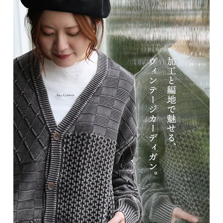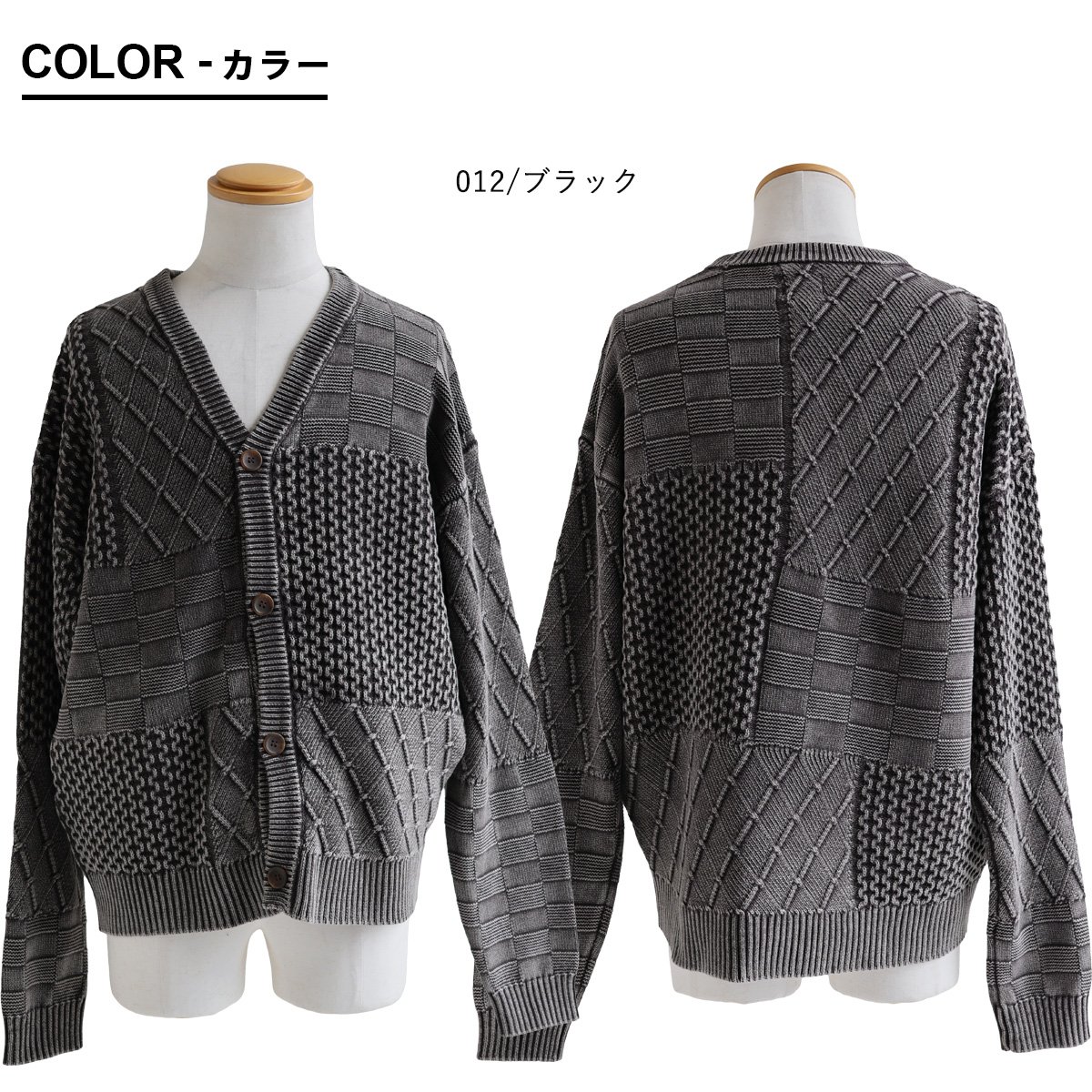 カーディガン ニット 長袖 メンズ レディース Vネック 綿100 コットン 厚手 重ね着 柔らかい 伸縮性 パッチワーク 褪せ色 秋 冬 ヴィンテージ レトロ カジュアル パティ