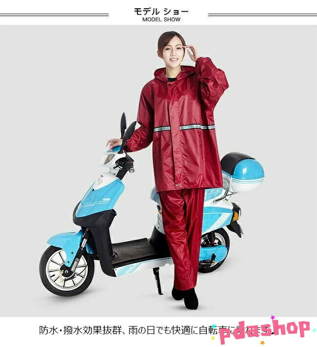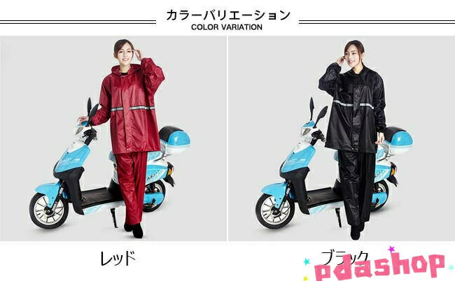 大人用レインコート上下セット新登場!防水・撥水効果抜群、雨の日でも快適に自転車に乗れます♪膝までカバーできるロング丈、フード付きで雨風をしっかり防ぎます。通勤や通学、お子様のお迎えなど様々なシーンで大活躍!カラー:レッド ブラック素材:ポリエステル PVCサイズ(cm):2XL お勧め身長145-160 お勧め体重40-50kg3XL お勧め身長160-170 お勧め体重50-70kg4XL お勧め身長170-178 お勧め体重70-80kg