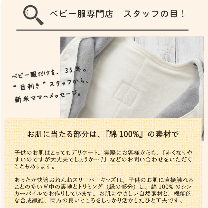 対象年齢 3歳〜8歳くらいのキッズまで使えます サイズ 110cm〜130cm 着丈約67.5cm・肩幅約42cm・身幅約42cm 素材 表地(フリースの部分):ポリエステル100% ハニカムメッシュの部分:ポリエステル100% 別地(シンカーパイルの部分):綿100% カラー ベージュ / ライトグレー 製造 ・日本製(当店のアイテムはすべて日本製です。) ・ホルマリン検査済/検針済 お洗濯について ご自宅でお洗濯していただけます。 ネットに入れて洗濯機をお使いくださいませ。 ラッピングについて BabyGooseオリジナルギフトボックス(300円 税込) ロゴ入り袋ラッピング(無料) ※メッセージカードをご希望の方は、 注文ステップ内の備考欄に100文字以内でご入力くださいませ。 ラッピングについて詳しくはこちらから>▼キッズデザイン賞受賞の秋冬限定あったか快適スリーパー、2023年は新色ピンクとモスグリーンが登場! 全カラー … △朝10時までの注文は即日発送 ただいまの受付分についても、なくなり次第終了となります。 出来るだけ多くのお客様にお届けできるよう生産体制を整えておりますので、何卒ご了承くださいませ。 商品名 あったか快適おねんねスリーパー キッズ 対象年齢 3歳〜8歳くらいまで サイズ 110cm〜130cm 着丈約67.5cm・肩幅約42cm・身幅約42cm・首回り約36cm・袖ぐり丈約19cm 素材 表地(フリースの部分):ポリエステル100% ハニカムメッシュの部分:ポリエステル100% 別地(シンカーパイルの部分):綿100% (当店のアイテムは全てホルマリン検査済です) カラー ベージュ /ピンク/モスグリーン 製造 日本製 (当店のアイテムは全て日本製です) お洗濯について 生地の性質上、お洗濯後多少縮むことがあります。ネットに入れてお洗濯後、形を整えてから干していただくことをおおすすめいたします。 ▼キッズデザイン賞受賞の秋冬限定あったか快適スリーパー、2023年は新色ピンクとモスグリーンが登場! 全カラー … △朝10時までの注文は即日発送 ただいまの受付分についても、なくなり次第終了となります。 出来るだけ多くのお客様にお届けできるよう生産体制を整えておりますので、何卒ご了承くださいませ。