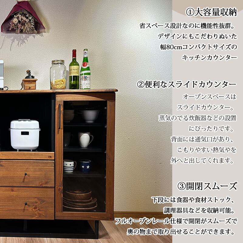 北欧 キッチンカウンター レンジボード レンジ台 幅80cm 80 引き出し 開き扉 開き戸 ガラス戸 キッチン 食器棚 家電 電子レンジ 炊飯器 収納 棚 木目調 脚付き パイン材 フルオープンレール ブラウン おしゃれ モダン 北欧スタイル 北欧風 カジュアル スタイリッシュ 新生活