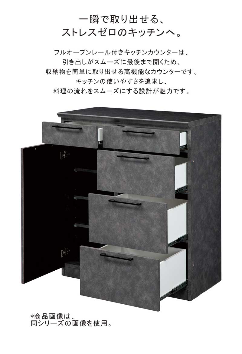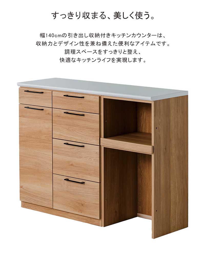 北欧 キッチンカウンター カウンター 幅140cm メラミン天板 アイカメラミン メラミン 家電収納 炊飯器 日本製 国産 引き出し 開き扉 収納棚 ダストボックス収納 フルオープンレール キッチン収納 木目 オーク ダーク ホワイト 北欧スタイル 完成品