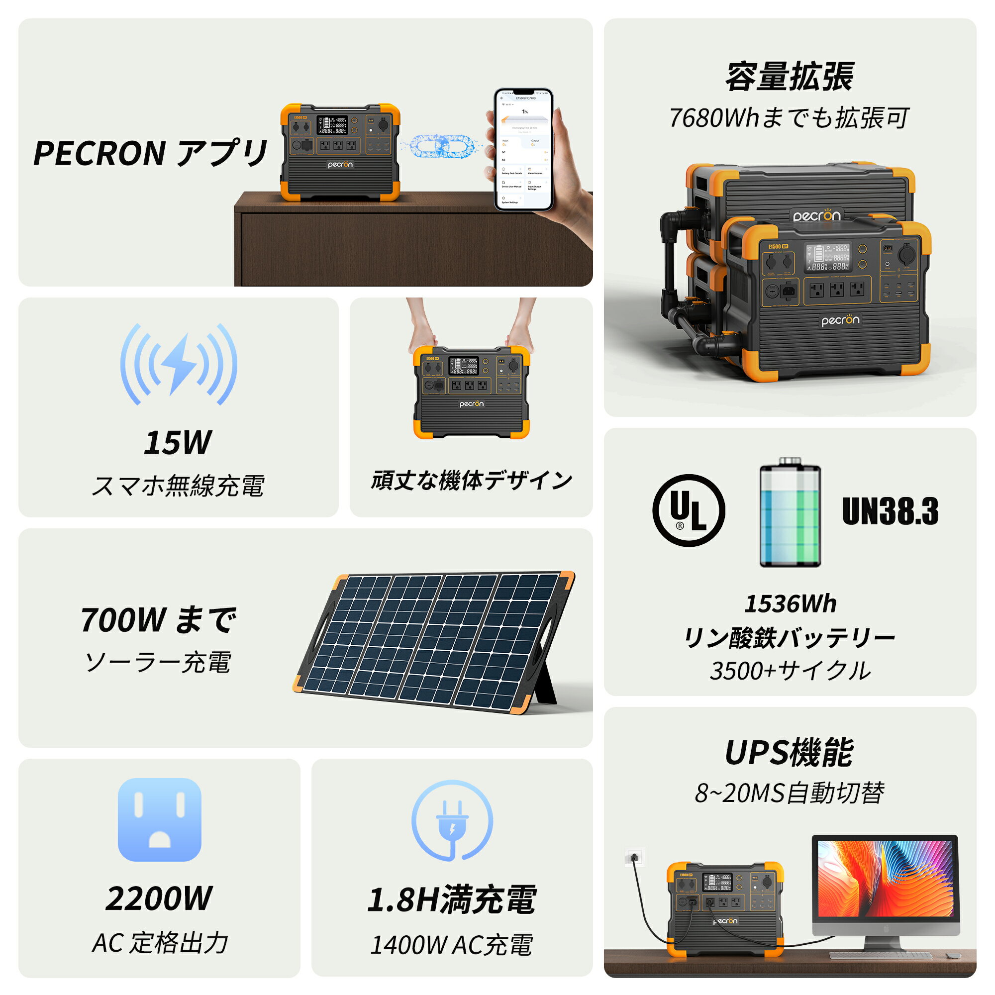 PECRON ポータブル電源 E1500LFP リン酸鉄 1536Wh/2200W 大容量 AC高出力2200W AC急速充電 1.8時間フル充電 アプリ遠隔操作 UPS機能 50Hz/60Hz切り替え MPPT BMS パススルー ソーラー発電 高耐久 純正弦波 蓄電池 家庭 電動工具
