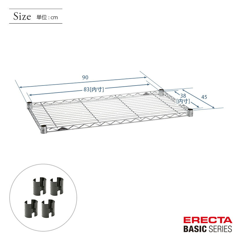 商品仕様 商品シリーズ ベーシックシリーズ ワイヤーシェルフ クローム 幅90×奥行45cm B1836C1 パーツ 外形寸法 幅90×奥行45cm シェルフ内寸(約) 幅83×奥行38cm 耐荷重 135/棚1段 ※垂直荷重(等分布) 内容明細 ワイヤーシェルフ1枚、テーパードスリーブ4組 材質 棚板:スチール(クロームメッキ、クリアコーティング仕上げ)、テーパードスリーブ4組(ABS樹脂・ブラック) 備考 モデルチェンジ前のホームエレクターはベーシックシリーズと同じモジュールで構成されており、互換性があります。ホームエレクターご使用の方で、追加購入をご希望の方は同サイズをお求めください。 ※掲載画像のコーナリングの刻印、プレートはモデルチェンジ前のデザインになります。※ルミナスのスチールラックシリーズと互換性はありません。ベーシックシリーズはデザインが変更されております為、予めご了承くださいませ。 型番 B1836C1 JANコード 4933315135456 メーカー エレクター株式会社
