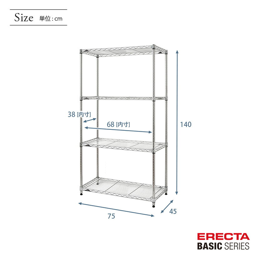 スチールラック エレクター ベーシック ERECTA ラック ベーシックシリーズ フリーラック 棚 収納棚 業務用 プロ仕様 収納 アルミラック カラーラック クローム 幅75×奥行45×高さ140cm 4段 RBR3018544C
