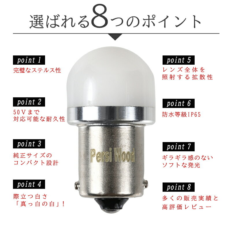 商品情報メーカー名persi wood(パーシーウッド)製品特徴■S25 シングル ピン角 180度 平行 ホワイト(BA15S 1156 P21W G18)【色温度】6000-6000K(ホワイト)【電流】0.252A【ルーメン】1200LM/球【消費電力】3.1W【入数 】10個【LEDチップ】3030SMD【電圧】DC9V-48V 12V車 24V車対応【極性】極性なし【視野角】360°【動作温度】-30℃〜+75℃【サイズ】39.5X20.5mm【用途】バックランプ・ウィンカー・ タイヤ灯 ・ ポジション・マーカー・ブレーキ 他【保証】ご購入日から6ヶ月間注意※以下車両ではご使用いただけません 交流 脈流の自動車及び2輪車※取扱説明書は付属しておりません。※ウインカーに仕様の際は、ハイフラ防止の為、ウインカーリレーの装備をお勧めいたします。※点灯時、灯体部とヒートシンク部は大変高温となります。 LEDとレンズの位置が極端に近い車両はレンズやハウジングが変形する恐れがあります。※消灯直後の、取り付け、取り外しはやけどや破損の恐れがあるため、避けてください。※こちらの商品は、精密、かつ繊細に作られておりますので、取り扱いには十分ご注意ください。※取り付けの際、発光部に力を入れず、ヒートシンク部をつかみ、取り付けをおこなってください。※取付サポートは行っておりませんので、取付作業は、自動車整備工場に依頼してください。※ドレスアップや観賞用の商品となります。ご使用の際は、道路交通法を守り自己責任においてご使用をお願いいたします。保証初期不良期間:商品購入日から14日間(往復送料弊社負担)使用障害保証:商品購入日から6ヶ月間(返送送料お客様ご負担)S25 LED シングル 24v led マーカー 10個セット トラック用品 LEDライト ホワイト マーカーランプ g18 シングル バスマーカー デベソマーカー バルブ サイドマーカー 12v 平行ピン 180度ピン r-21 24v led マーカー球 10個セット 12v s25 led シングル ホワイトトラック用品 LED 車検対応 デフューザー搭載、高ルーメンチップ3030MD 48Vまで対応の高耐久性能モデル ■S25 シングル球 LED(P21W 1156 S25 G18 BA15S)ピン角180度■DC9-48V 12Vの普通車から、24Vの四駆車、大型トラックまで幅広い車種に使用が可能です。■高演色 高ルーメン LEDチップ3030SMD 9基搭載 自然光に最も近い光を再現。■乳白色のPCカバーにより 優れたステルス性と、光を拡散させる性能に優れムラなく照射。■48Vの電圧まで対応可能な基盤を採用している為、非常に耐久性能に優れております。■ホワイト6000K-6500K !■昼間でも優れた視認性を発揮、夜は光がムラなく拡散、他のドライバーへの迷惑を回避。■純正球とほぼ同じサイズ、極性フリーで取付は簡単!そのまま差し込むだけです。■ハロゲンと比べ消費電力が少ない為、バッテリーへの負担を軽減。■定電流回路搭載、電流にムラの無いよう自動制御します。LEDチップへの負担を軽減。■航空機用アルミニウム採用により、放熱効果に優れており耐久性に非常に優れております。■パッケージ:persi woodオリジナル帯電防止袋密封式■6ヶ月商品保証※ウインカーで使用の際は別途、ウインカーリレーを取り付けてください。 不良率0.1%!全球点灯確認済み デフューザー搭載によりムラの無い配光を実現 非常に高いステルス性能 高演色LED 3030SMD搭載 360°ムラなく拡散 クリアレンズでも目立ちにくい 多用途 防水 無極性 ポン付OK 24vの大型トラックにも対応できるよう、48Vまで電圧が上がっても問題ございません。また白のデフューザー搭載により非常に目立ちにくく、かっこよく愛車をカスタマイズします。 13時までのご注文とご入金確認で当日発送致します(日曜日を除く) 1